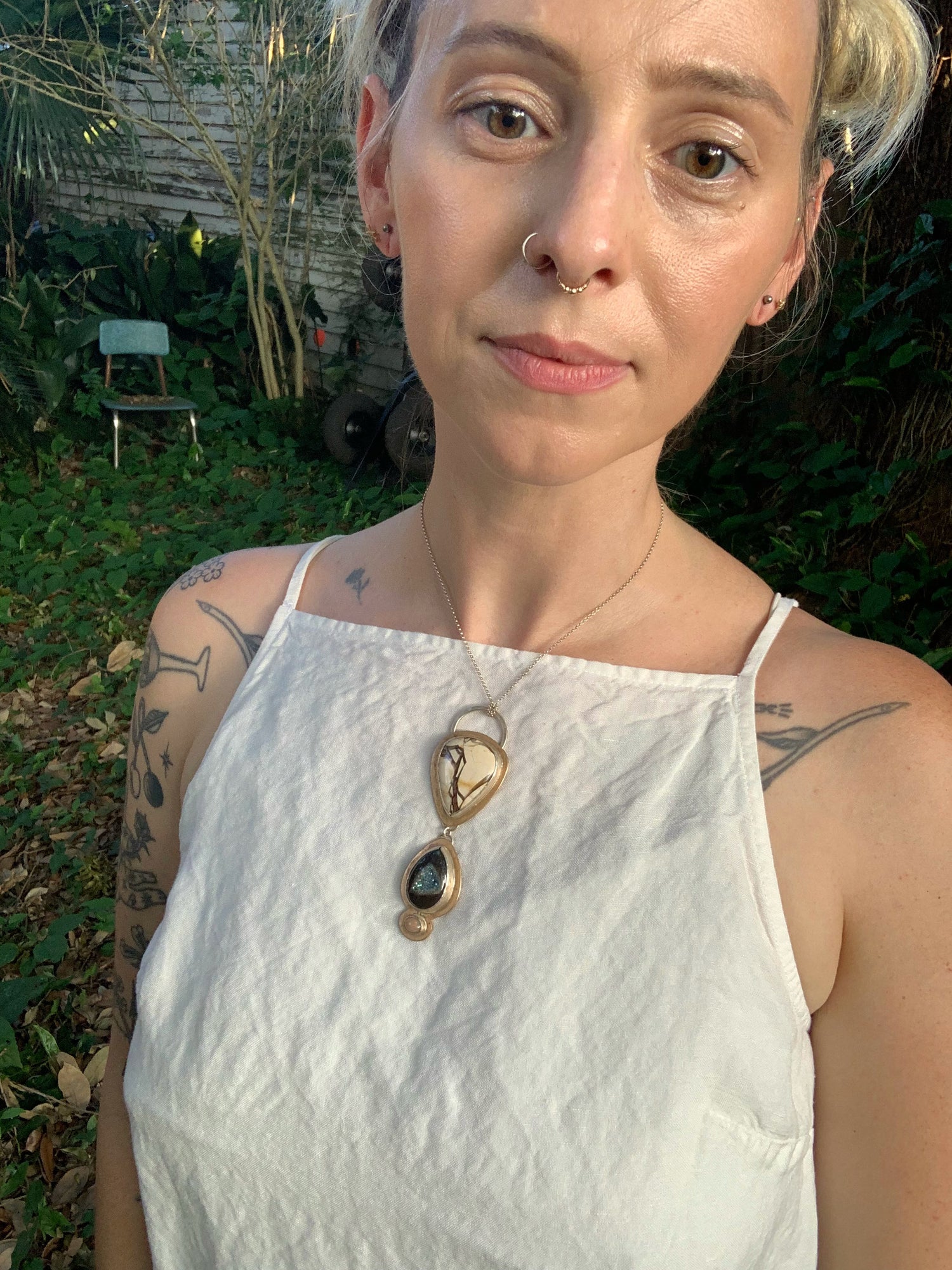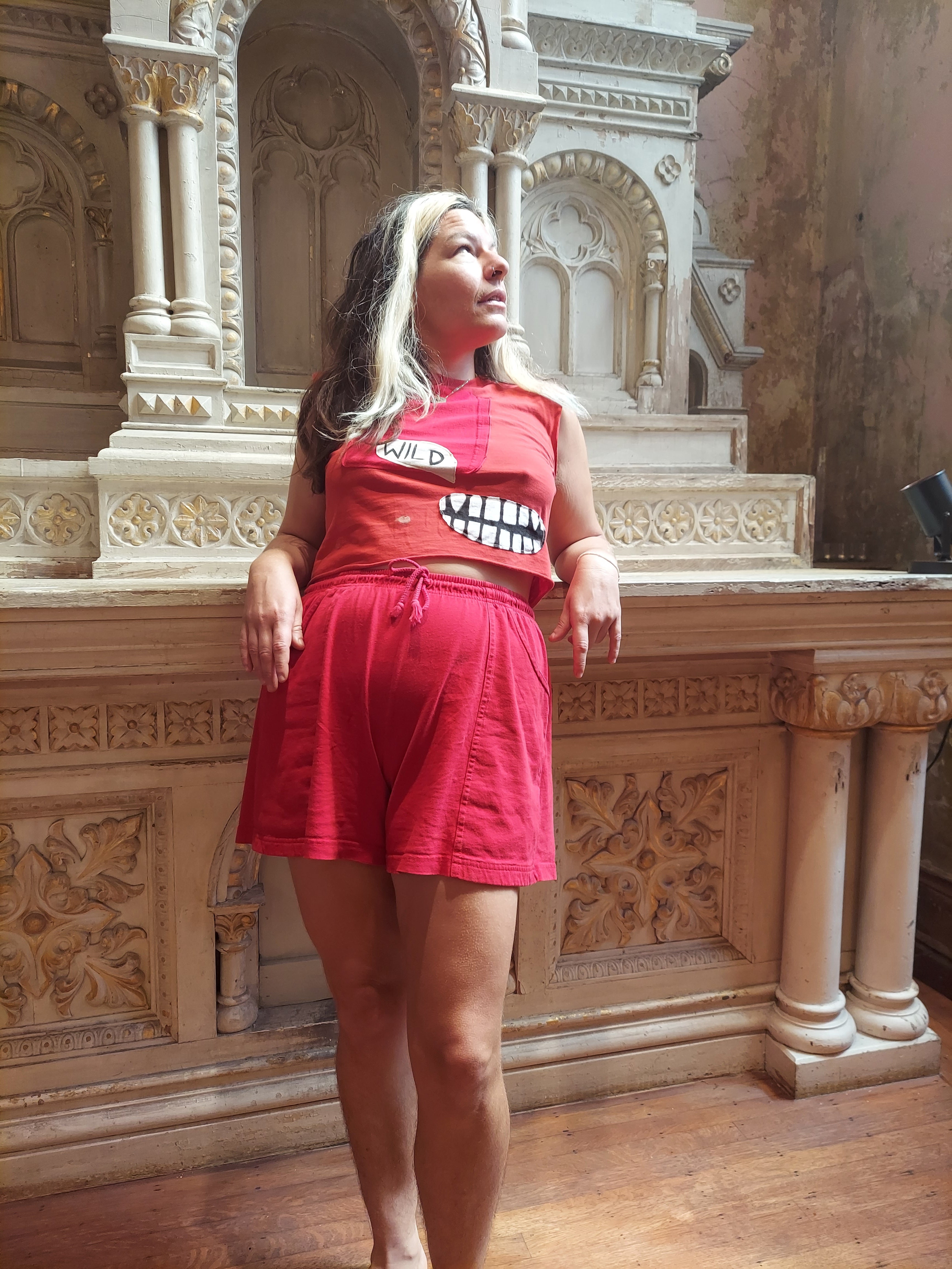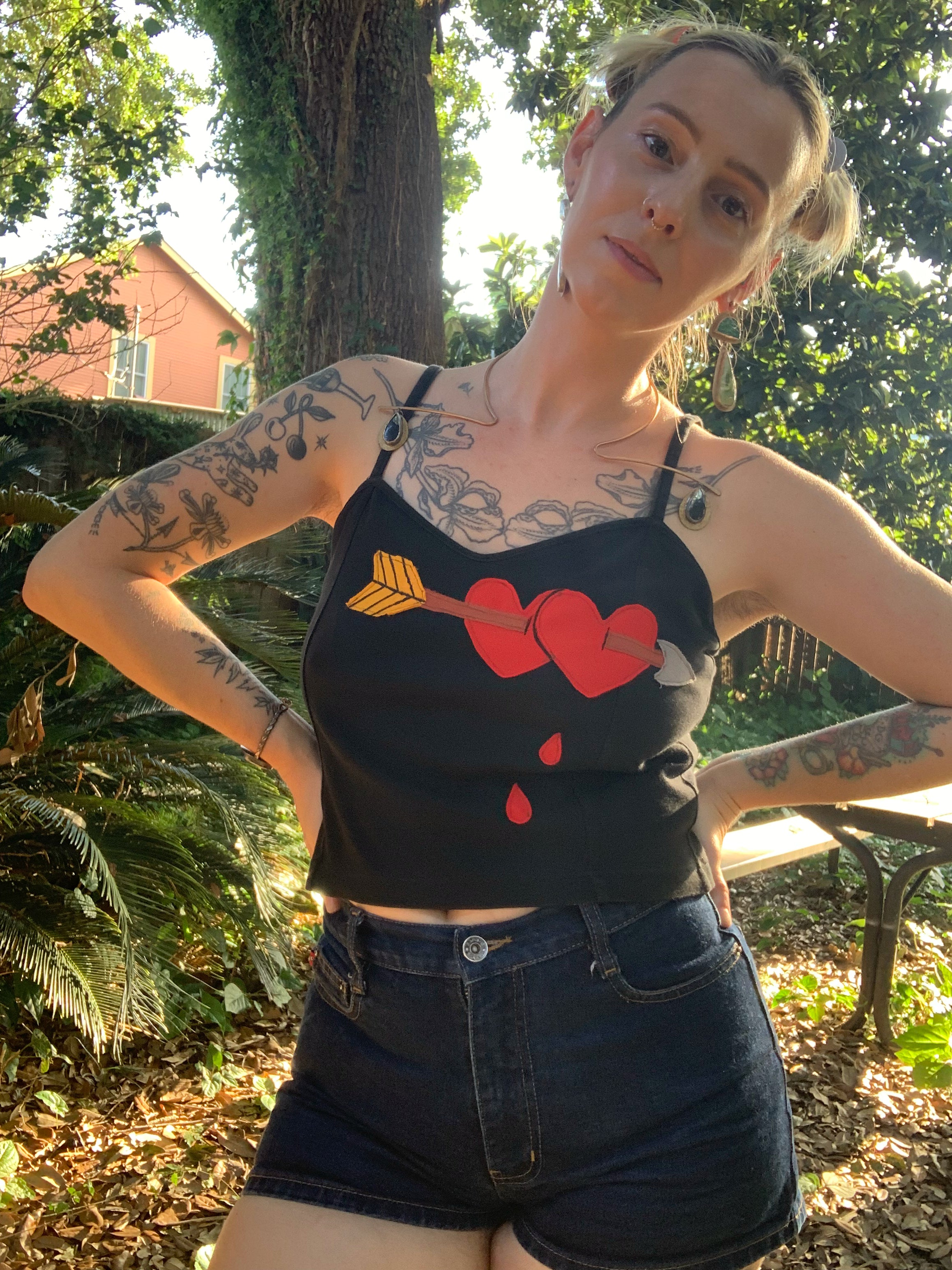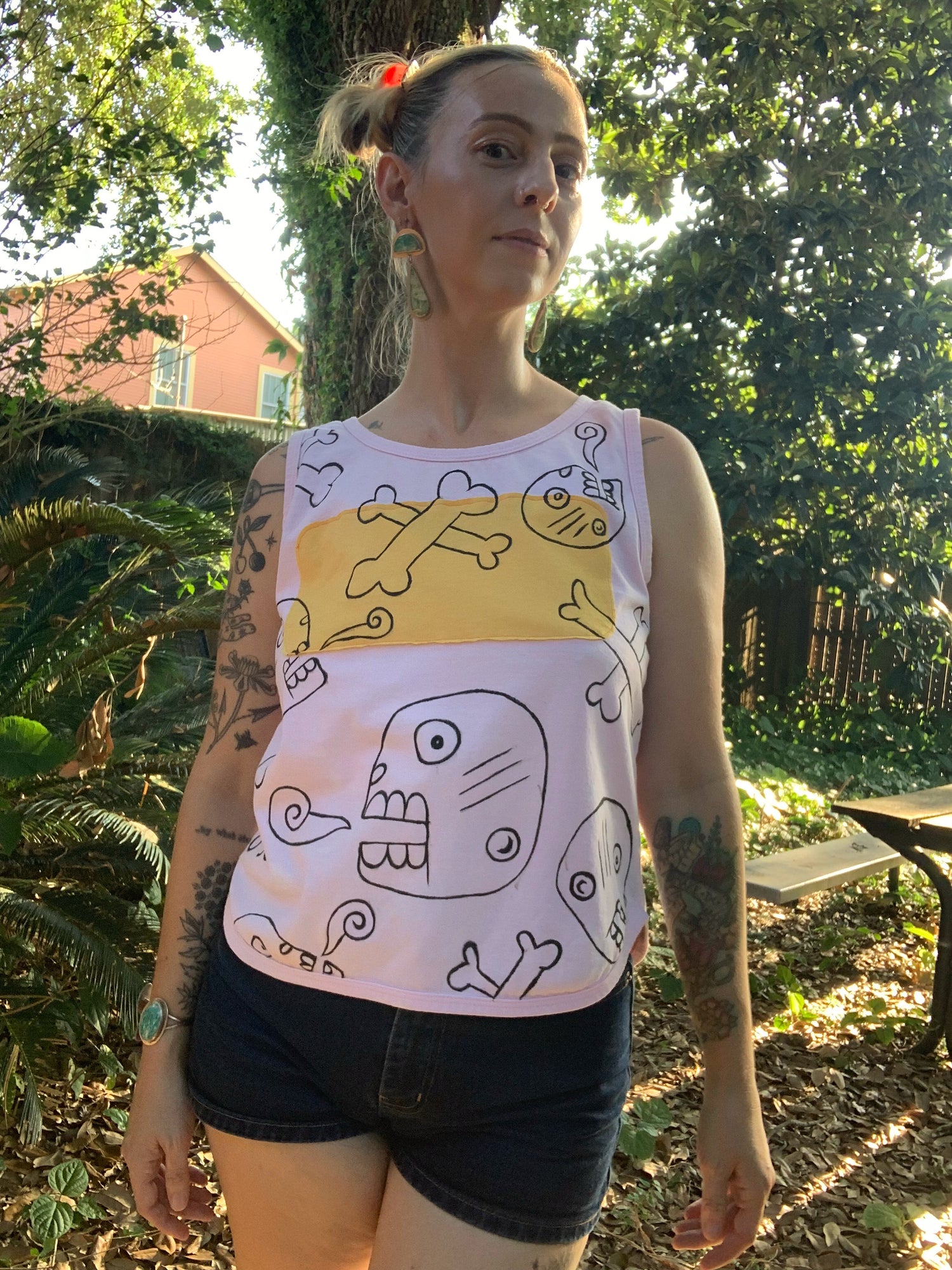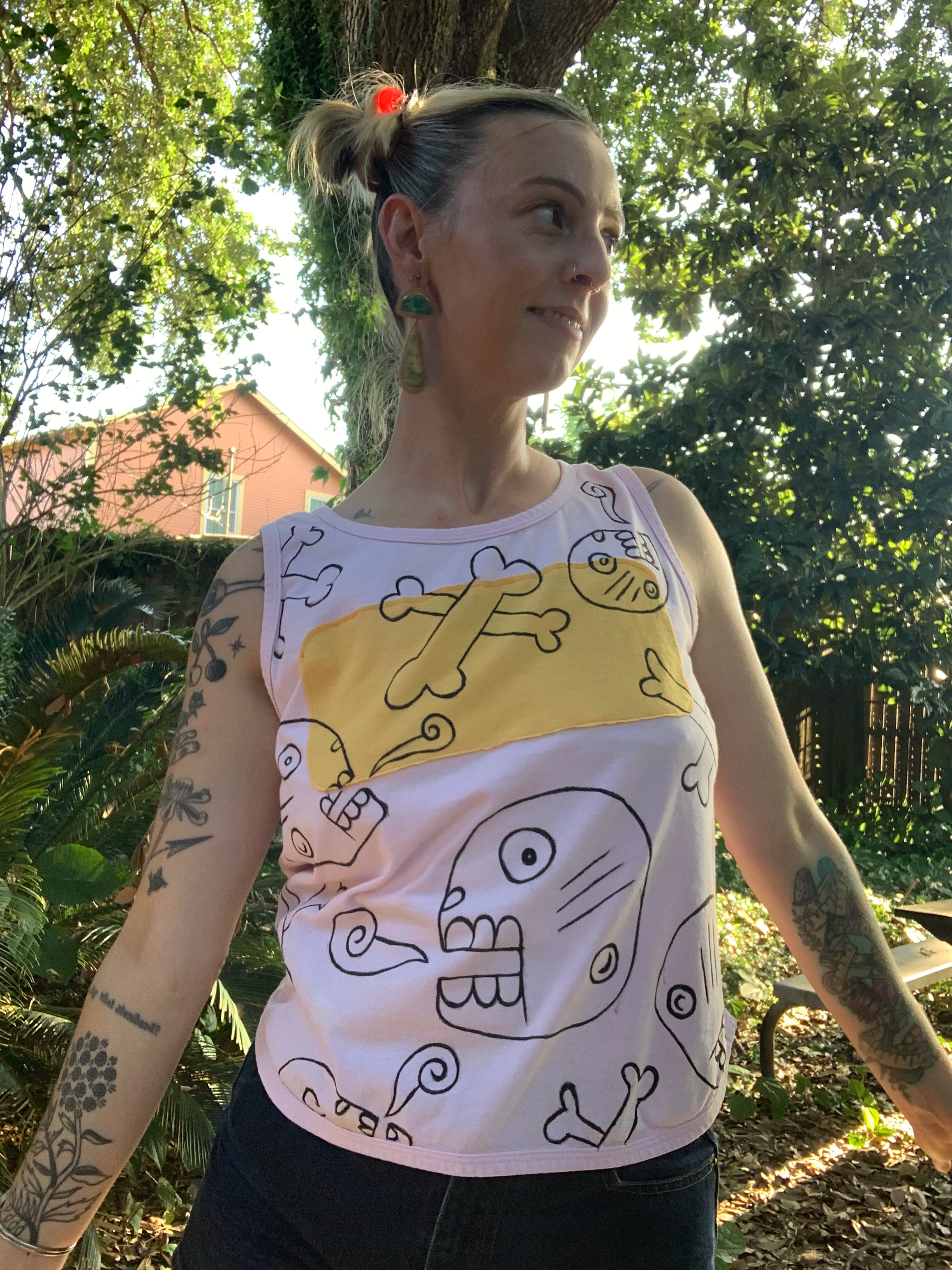 This light pink tank has custom hand painted Aztec skulls and bones speaking to you from beyond the grave. Have a little chat with a dead relative on day of the dead or just hang out in the park eating an ice cram cone. There are so many possibilities with this this tank. You'll be livin' it up, just like the old days. Show off your spooky street style with this one-of-a-kind design. Who knew the afterlife could be so stylish?