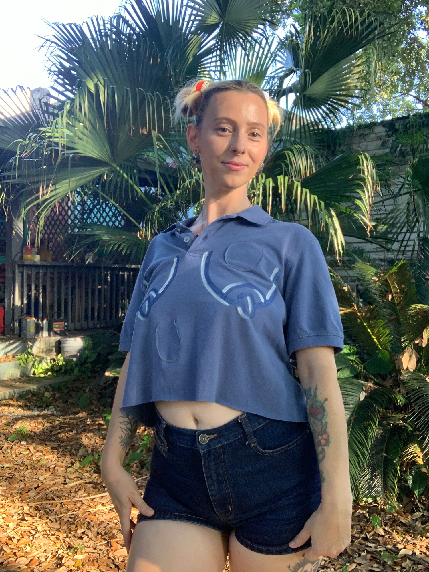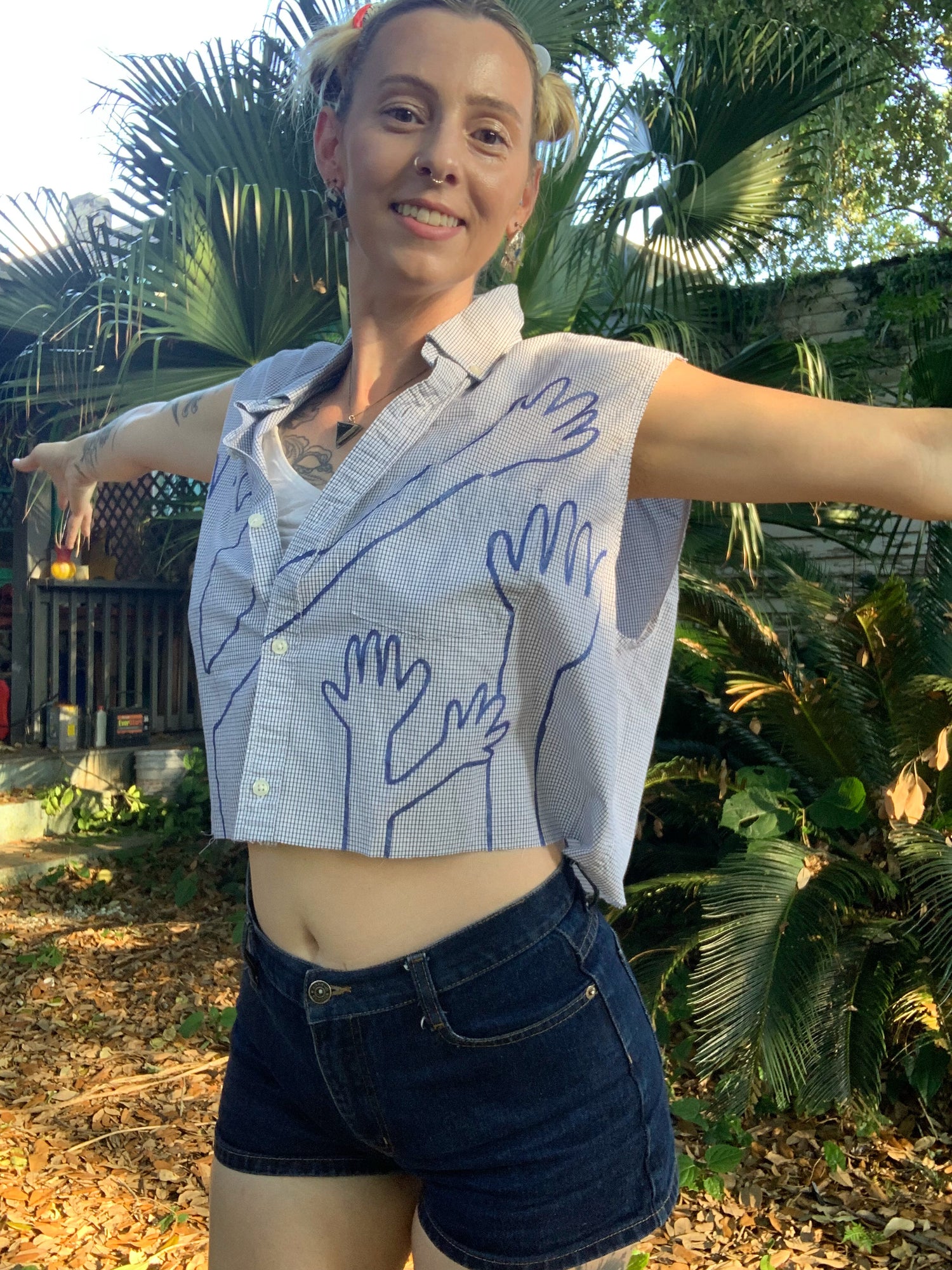 This cropped button up has a bunch of hand applied hands all yearning for your attention. Uplift your wardrobe with this bespoke crop that gives you all the admiration you deserve!