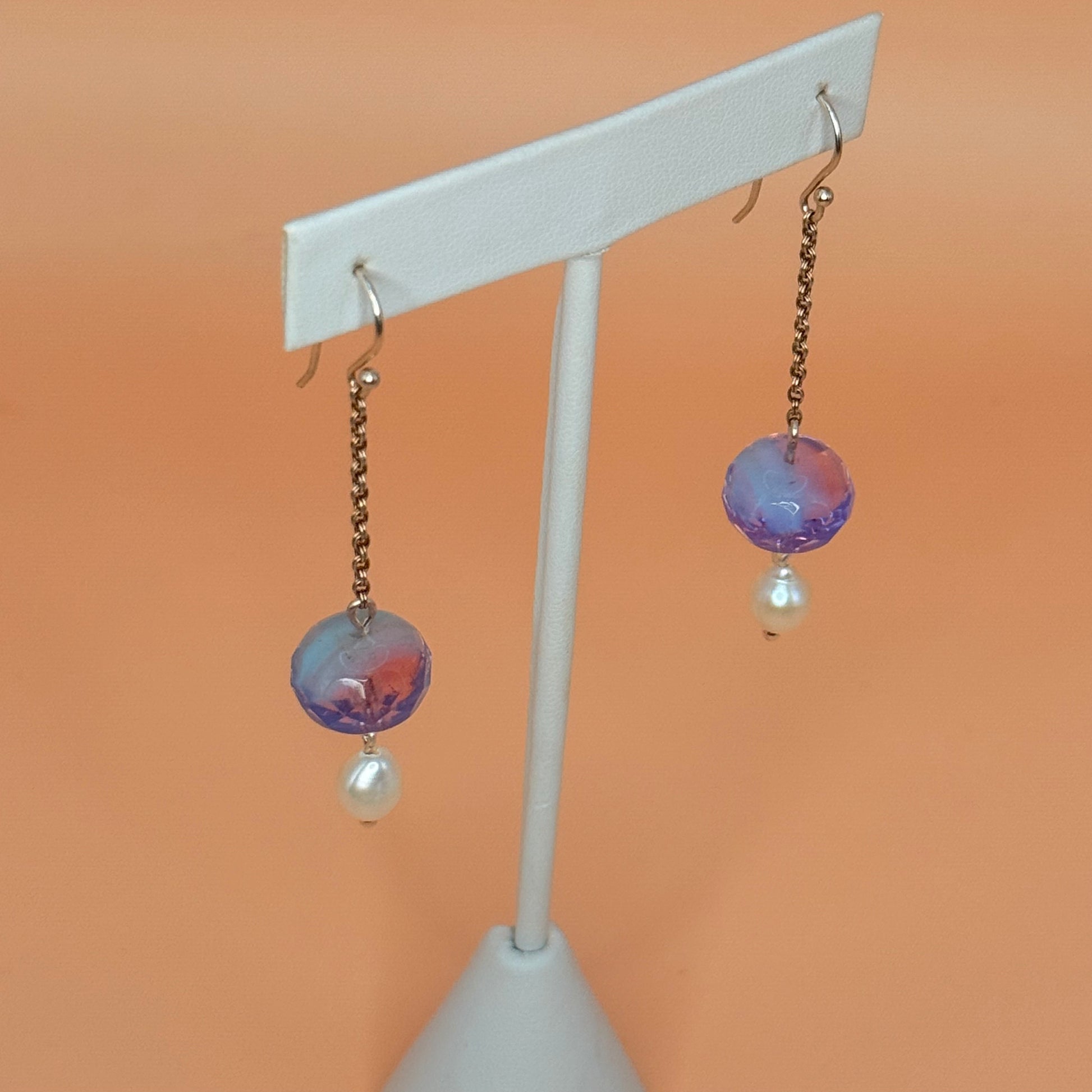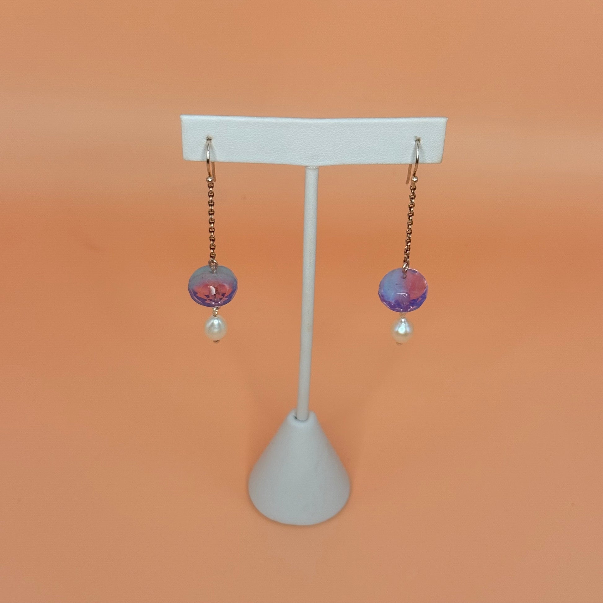 Sterling silver, vintage uranium glass beads, pearls. Each pair will have subtle variations due to the natural and handmade quality of their components. 2" drop.