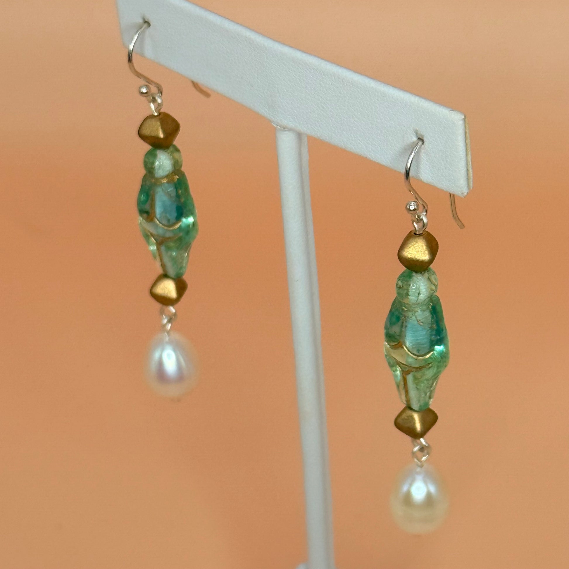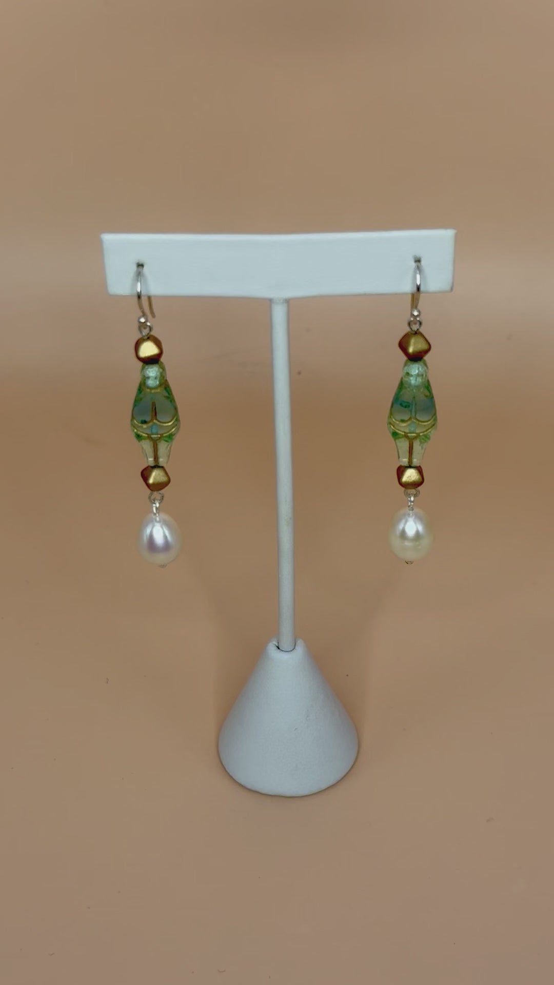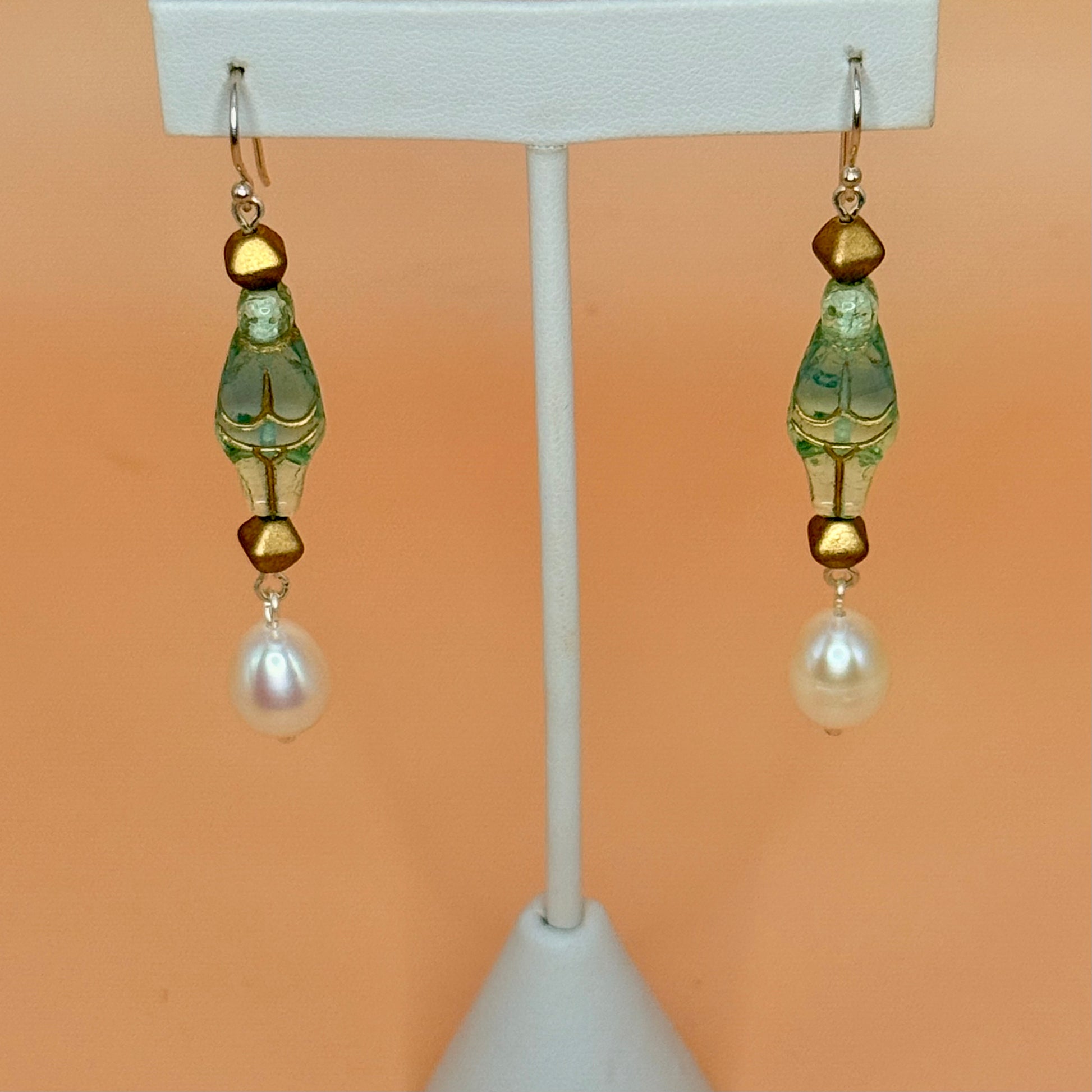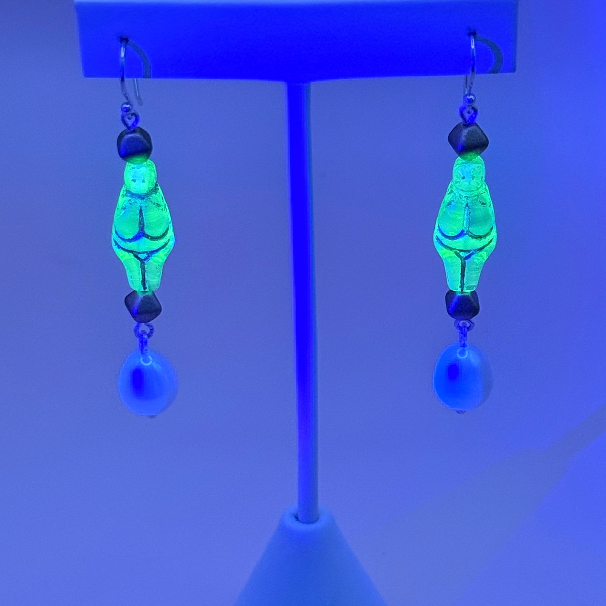 Sterling silver, vintage Czech glass beads, uranium glass Venus beads, pearls. Uranium glass glows under blacklight. 2.25" drop.