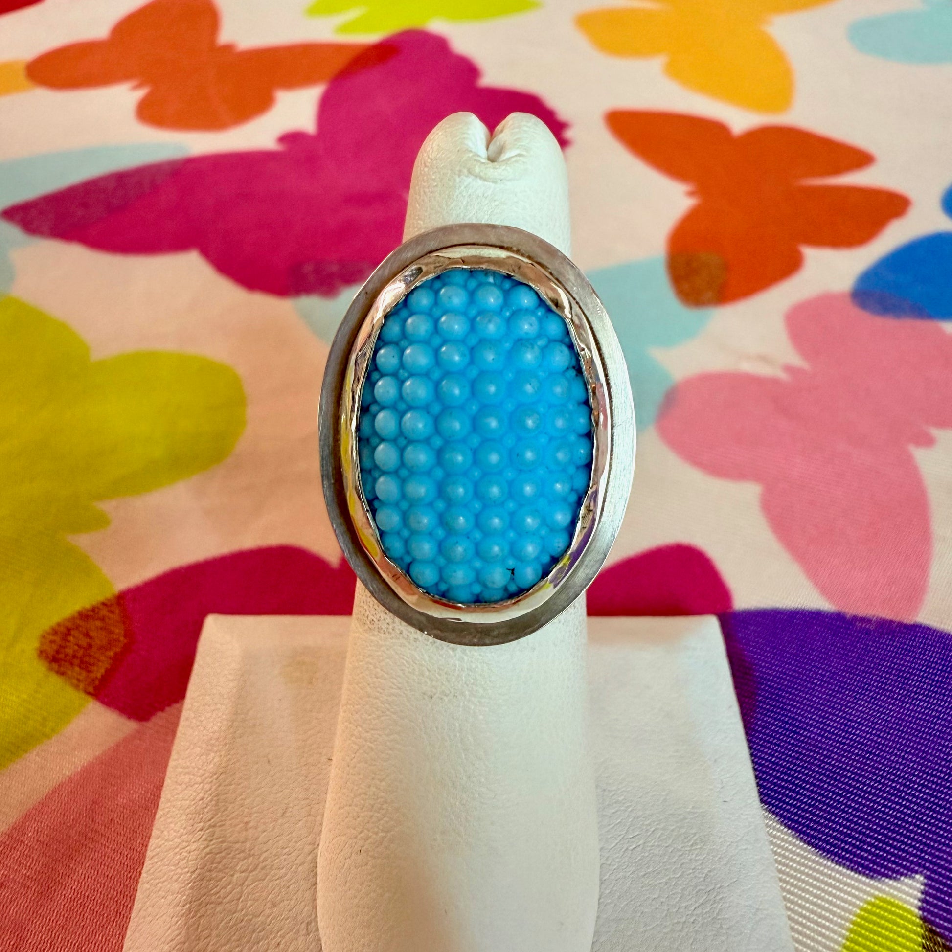 A vintage glass cabochon with a raised bubble texture and matte finish, bezel-set in sterling silver. Measures 20mm x 30mm.