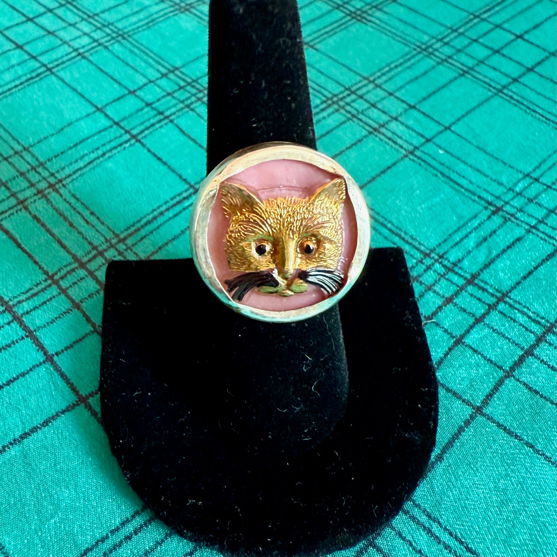 A vintage upcycled, hand-painted pressed glass cat button, bezel-set in sterling silver. Diameter measures 24mm.