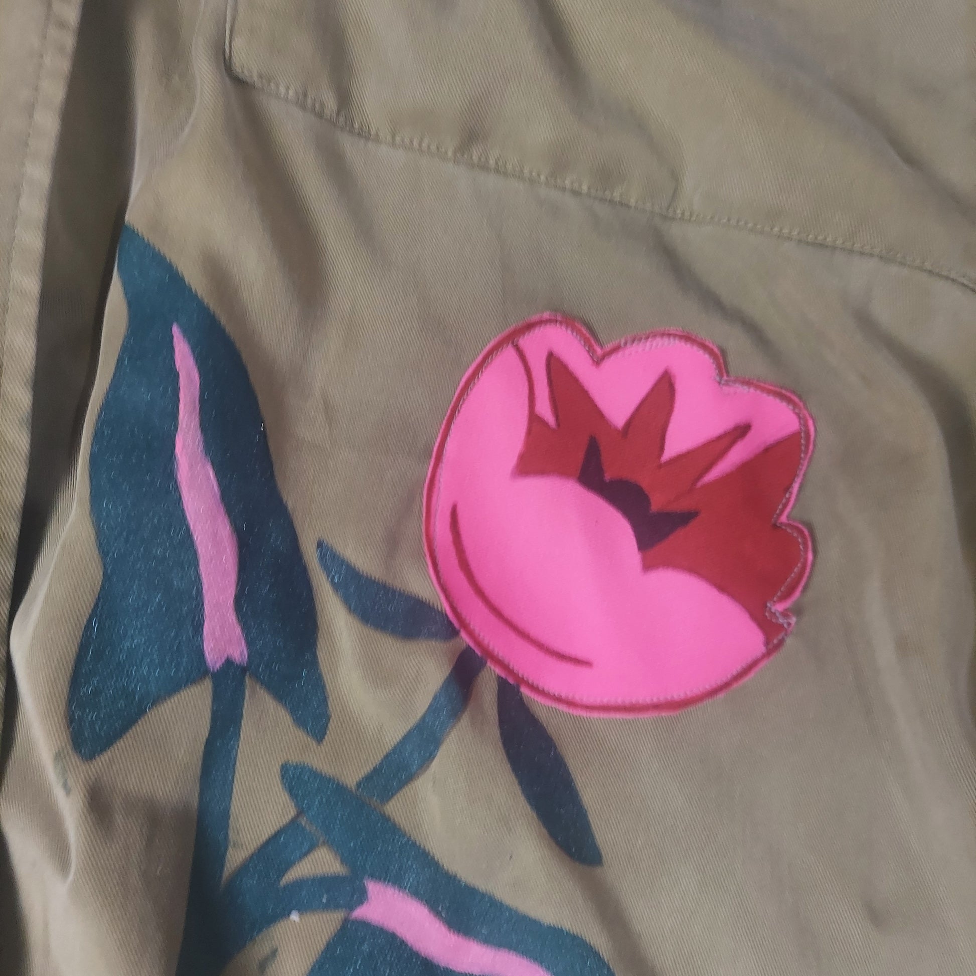 This tall shirt canvas features an abundance of hand-painted applique flowers cascading across the front. The flowers float and dance, transforming an ordinary work shirt into wearable art. Carry an entire enchanted meadow wherever you wander.
