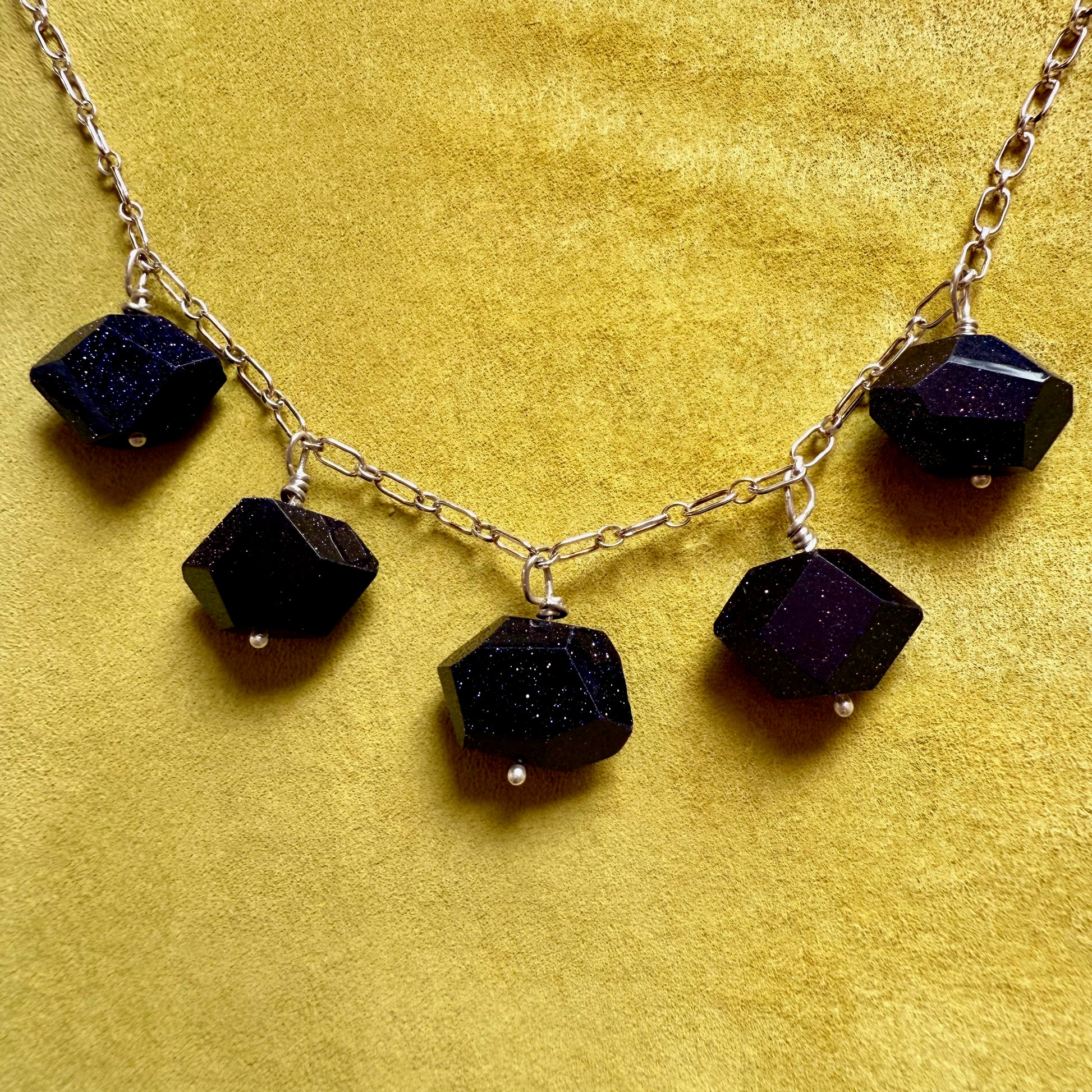 5 faceted chunks of blue sandstone on a 16" sterling silver chain with a 3" extender.
