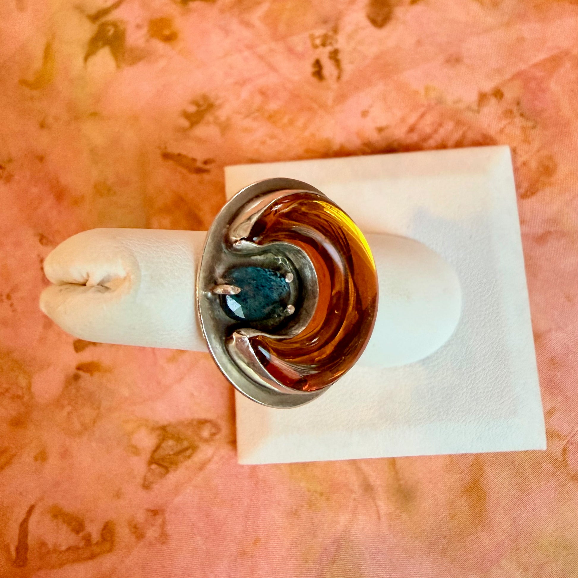 One of a kind ring made with a bezel-set vintage foiled glass crescent moon and prong-set rose cut kyanite stone, all in sterling silver. Diameter measures 28mm.