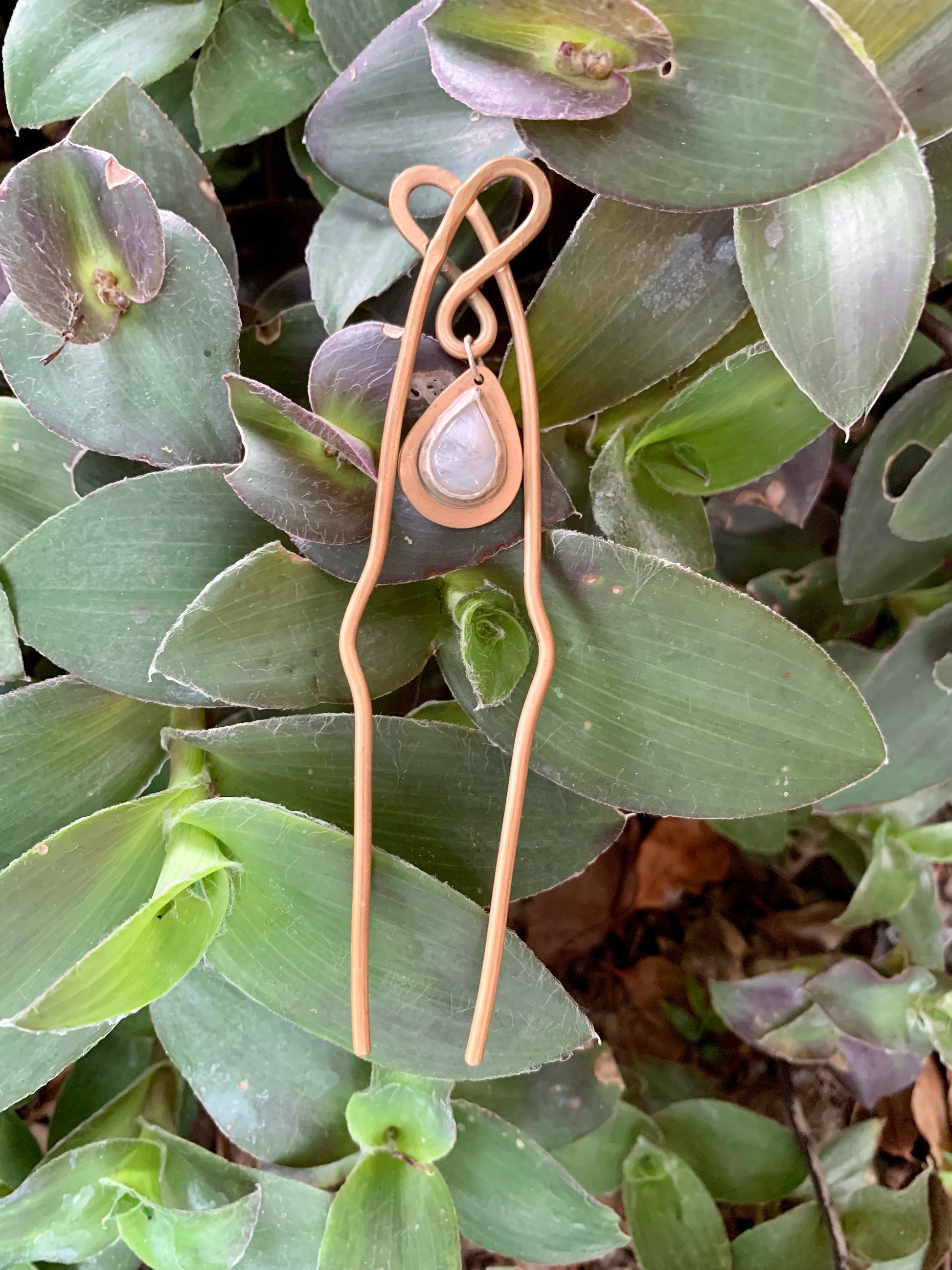 Brass hair pin with an articulated moonstone pendant set in a sterling silver bezel. Measures 5.25 inches (13.3 cm) in height.