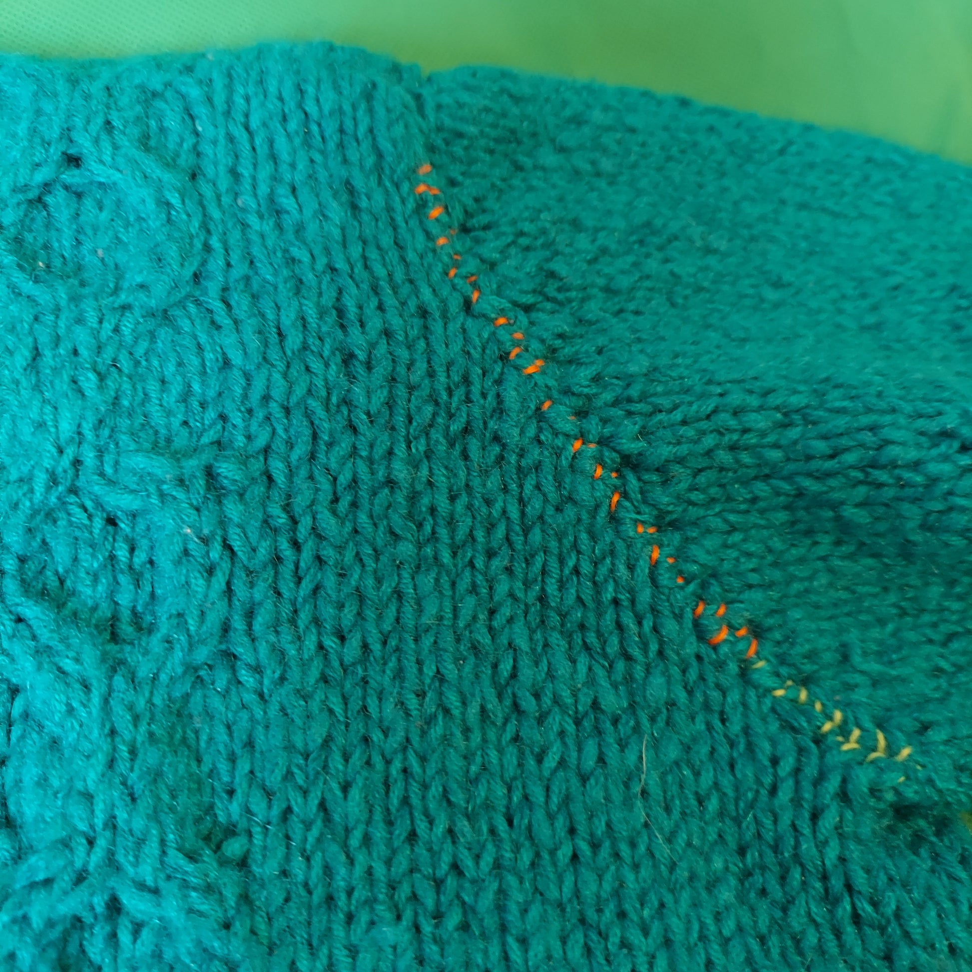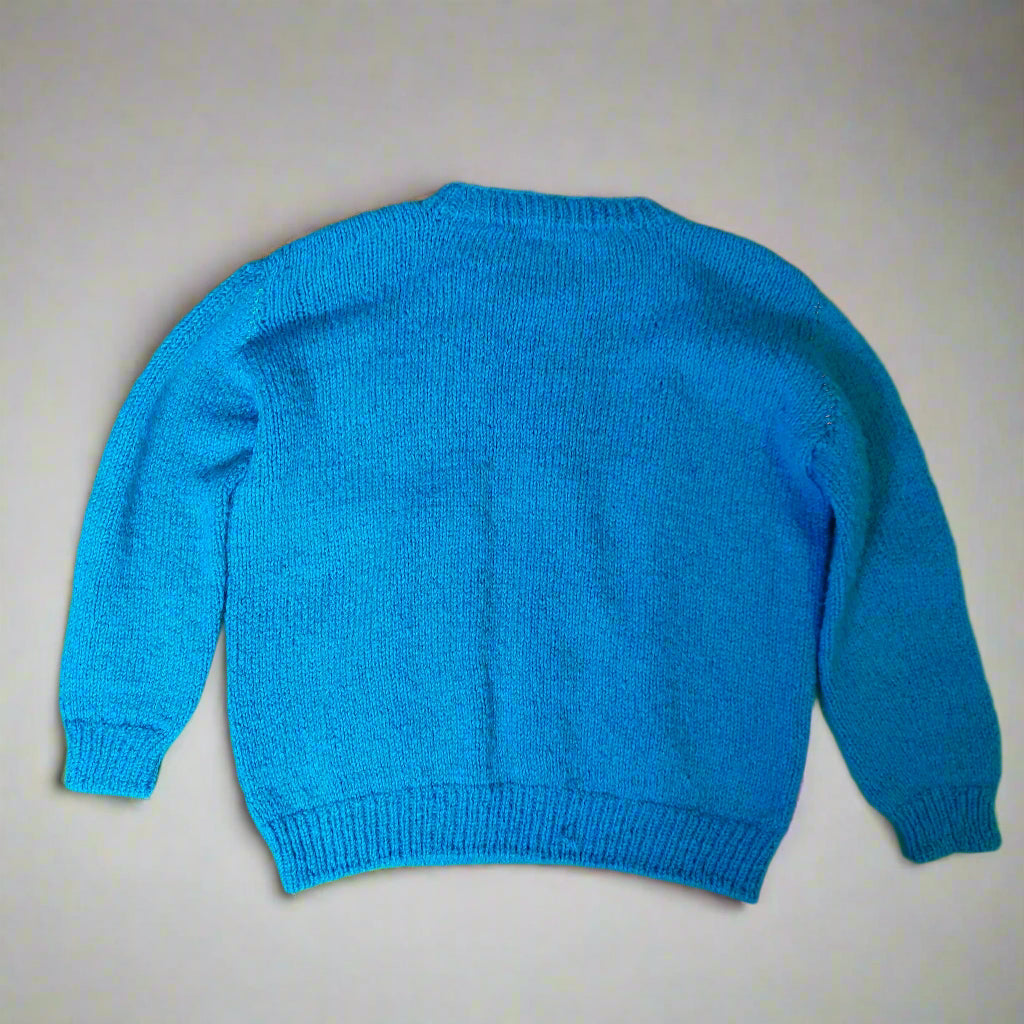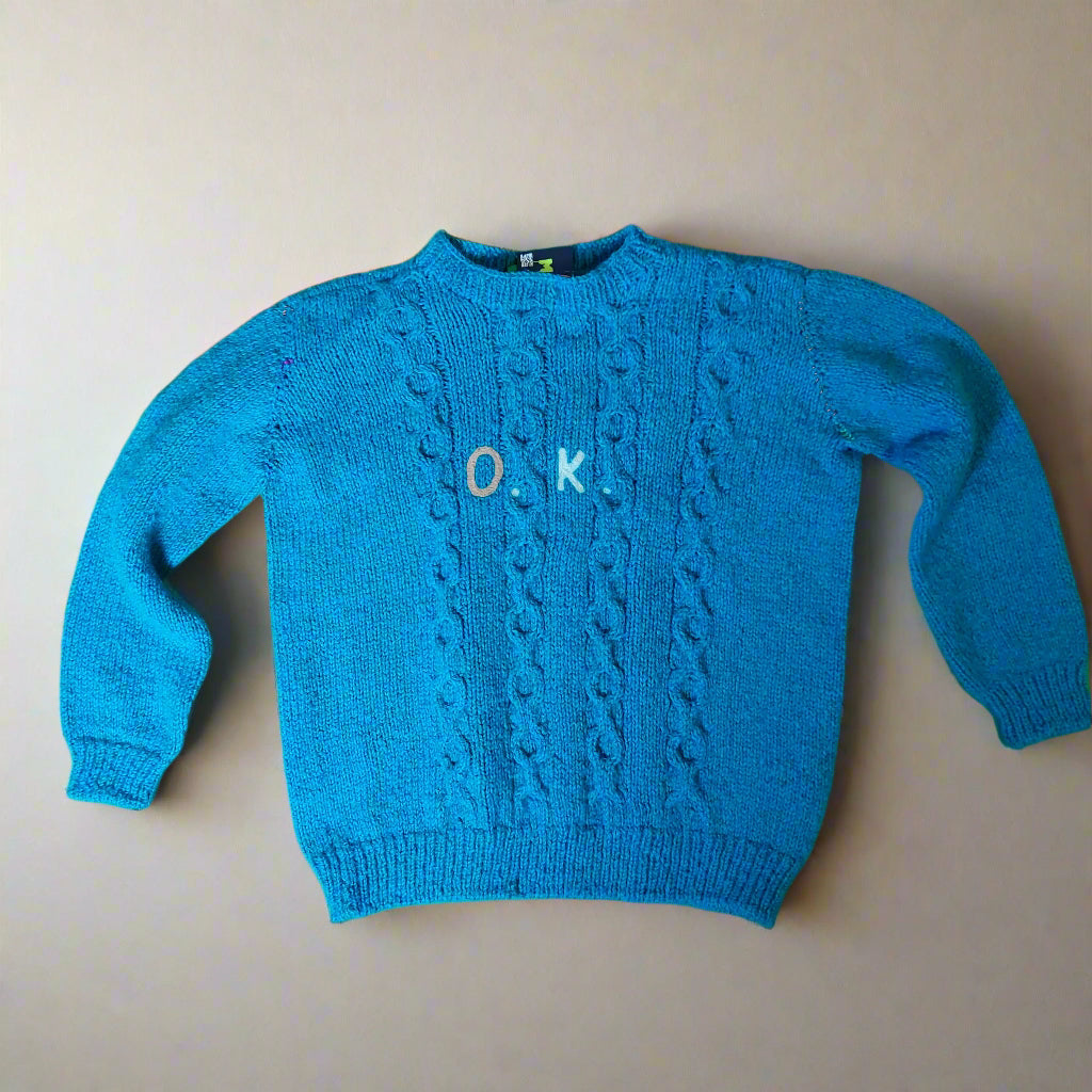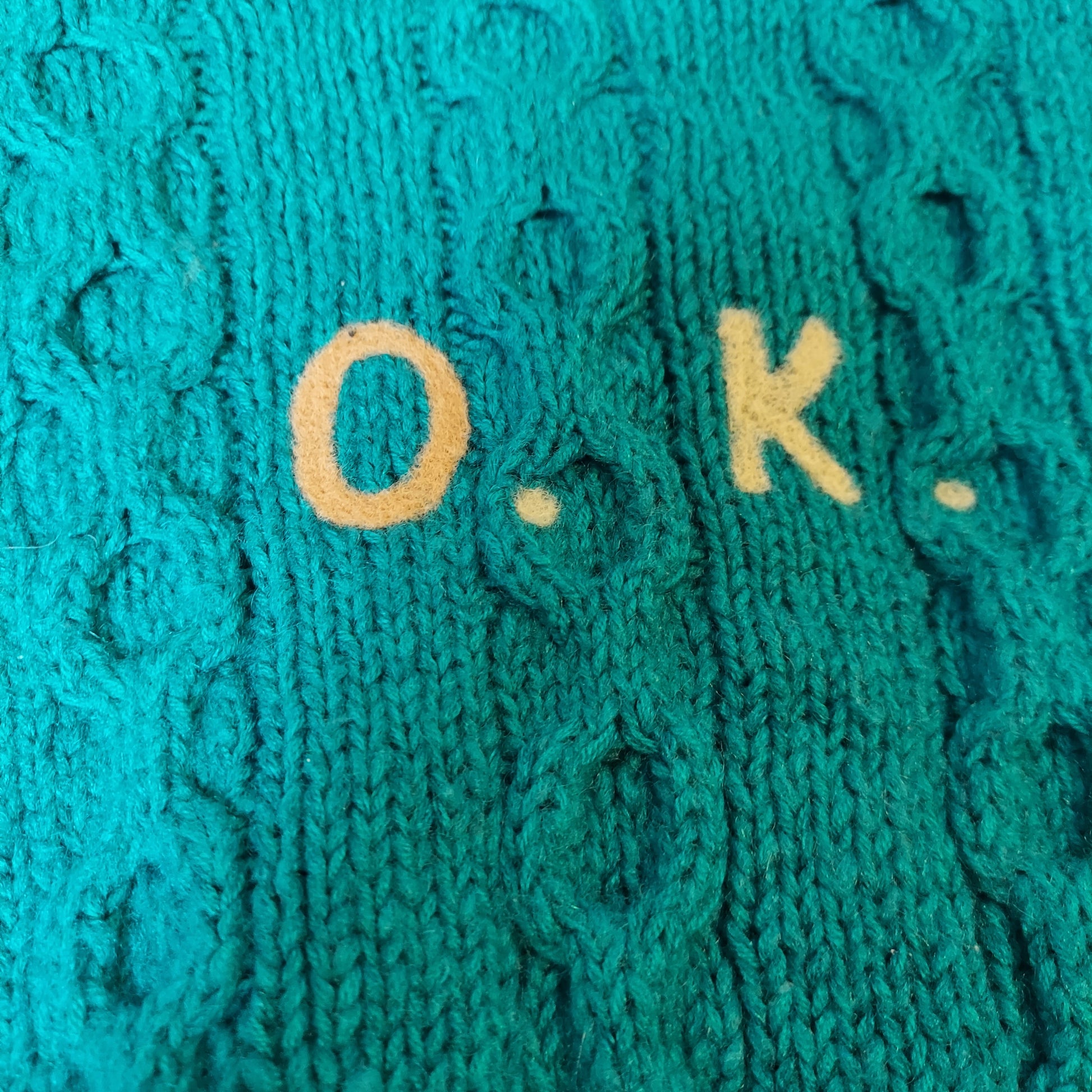 This this wool sweater has an O.K. embroidery on is chest and will keep you cozy. It's a bit greener than the picture, like the closeups, and has had some mending done as well. Medium - Large
