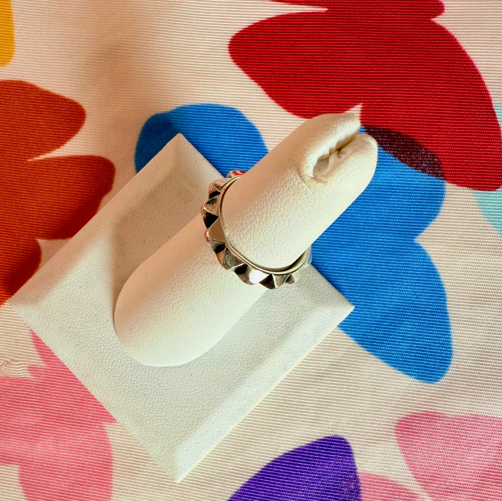 The Kate ring is made from solid sterling silver, hand-filed into an infinity band of studs. Add it to your stack or wear it on a chain for a little extra edge.