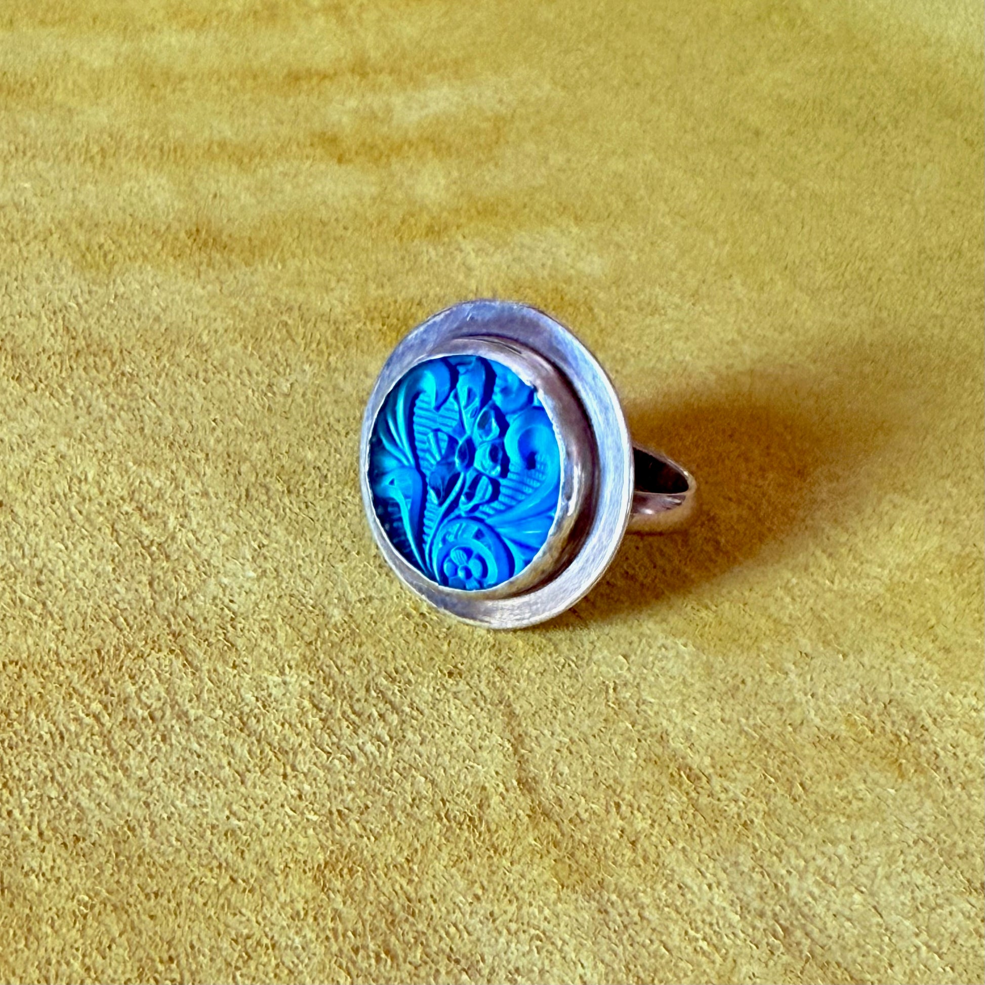 Vintage color change pressed glass cabochon, bezel-set in sterling silver. Diameter measures 22mm.