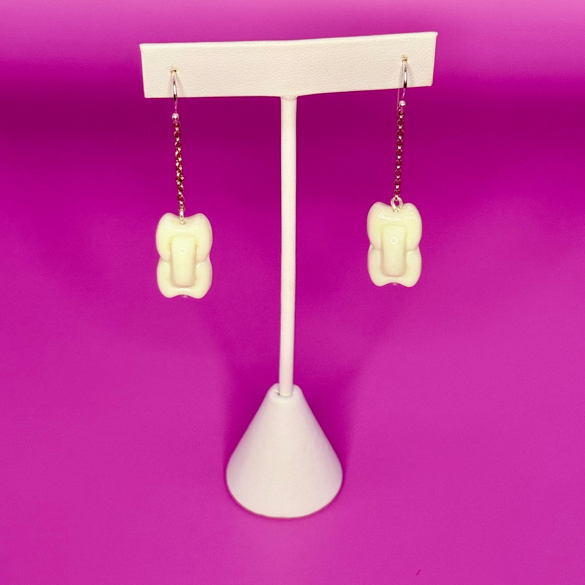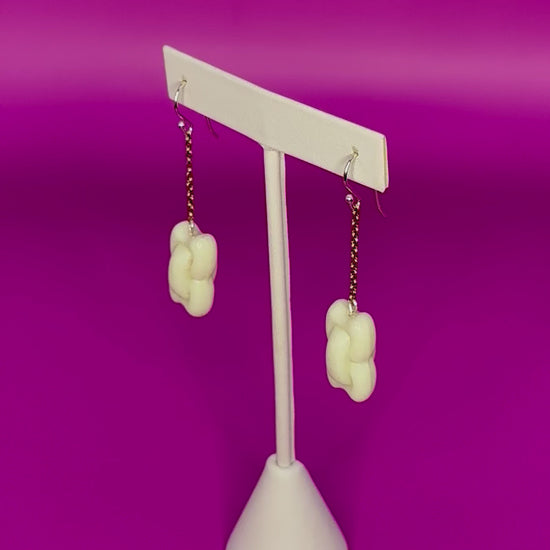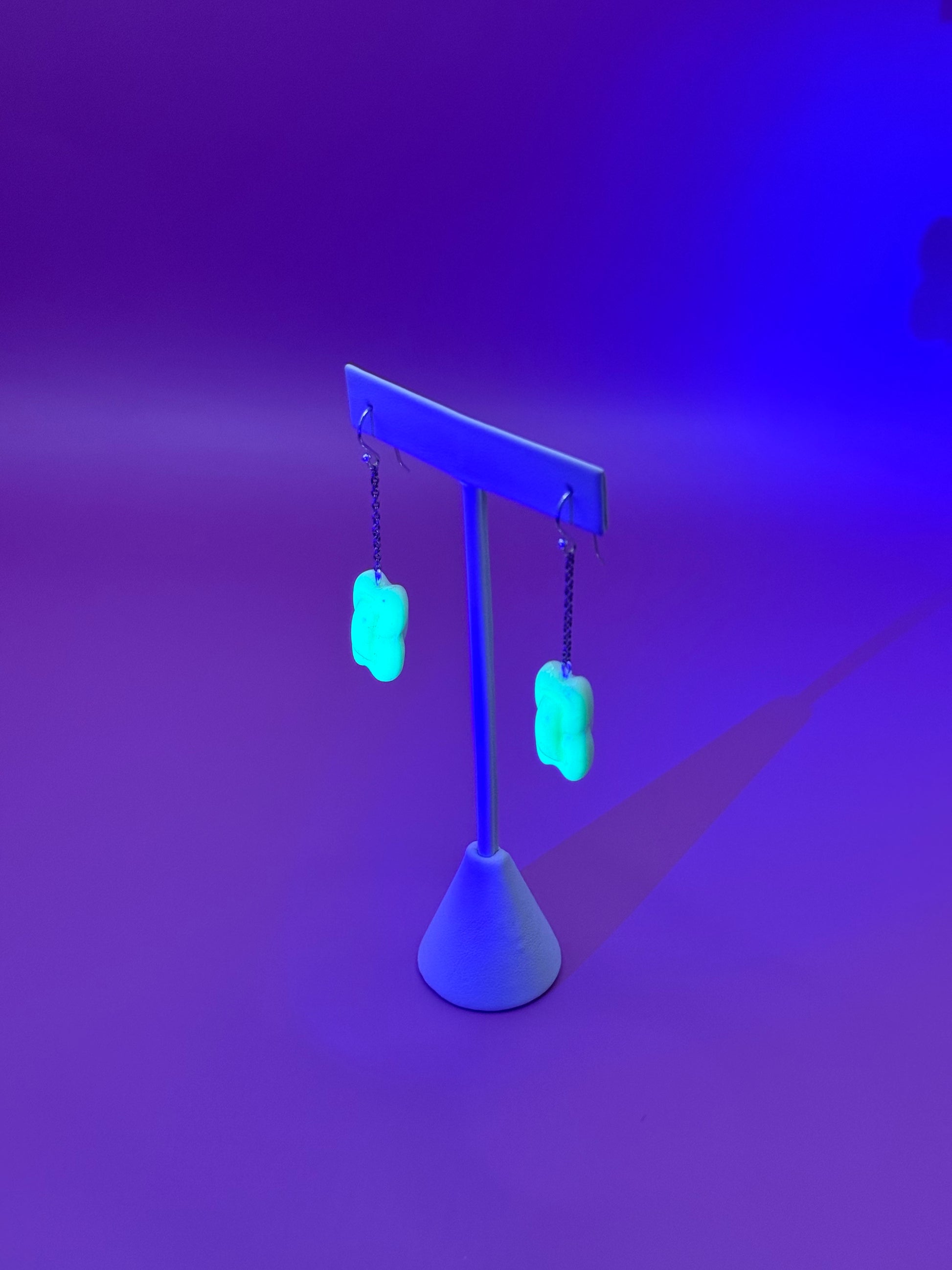 These versatile, lightweight drop earrings will lend a little bit of edge to your jewelry collection. Sterling silver, vintage uranium glass chain link beads that glow under blacklight. 2" drop.