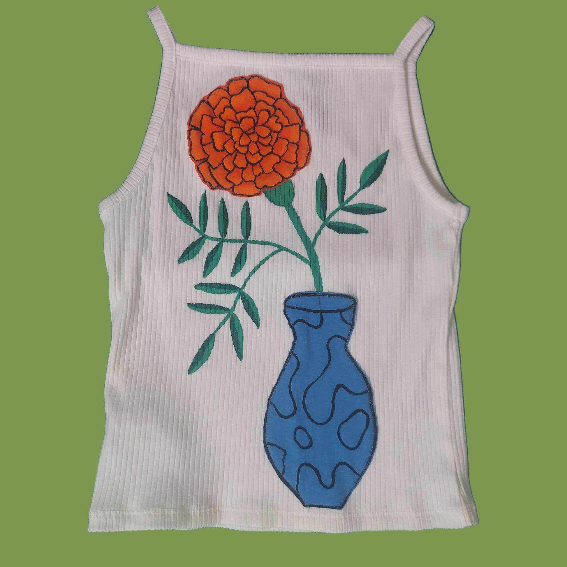 A marigold emerging from a ceramic vessel, rendered in across this sleeveless strap top. Refuse to dress like everyone else. Crafted for sizes small to medium, this conversation starter celebrates moments and things.