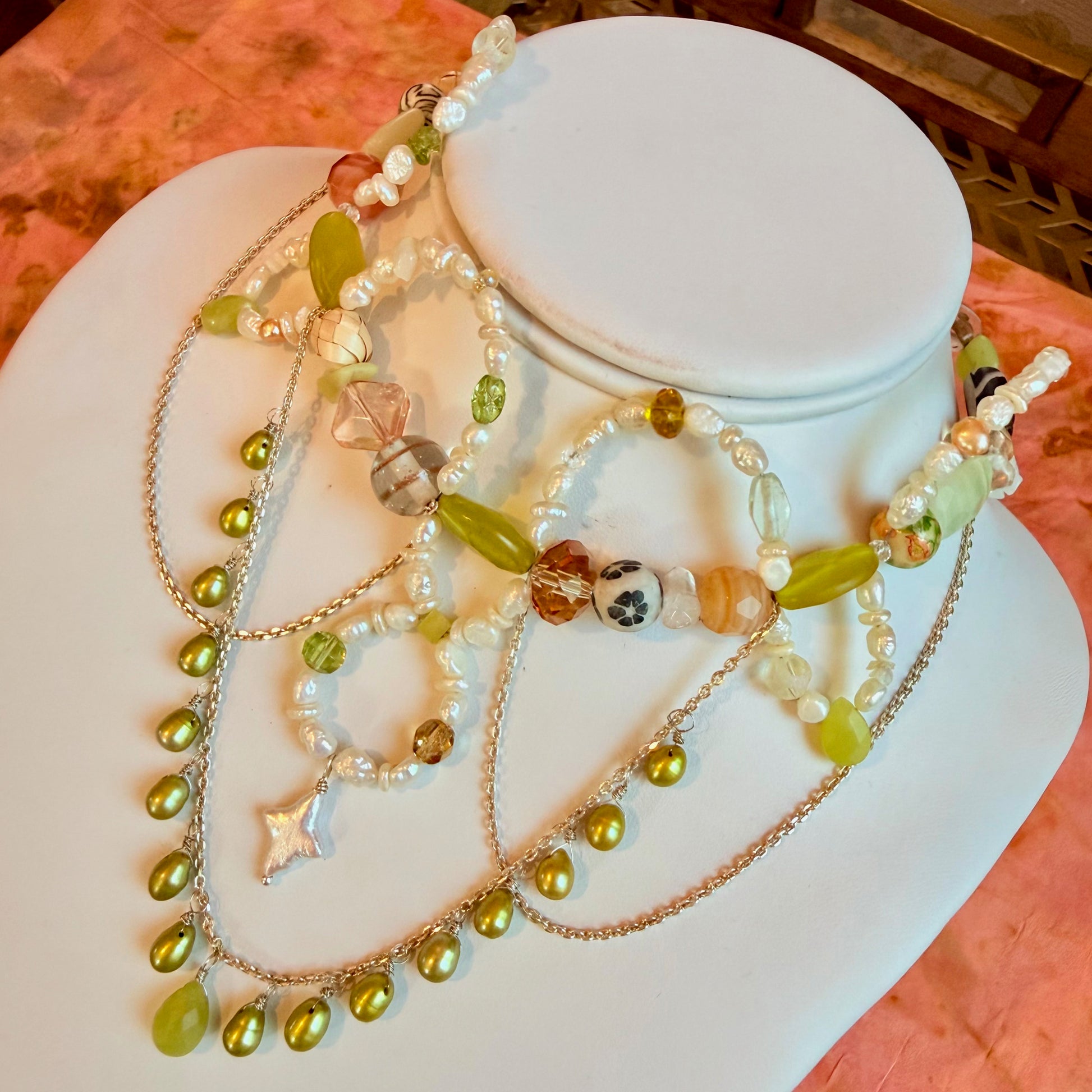 How to even describe her?!? Made with a variety of pearls, reclaimed and vintage beads made from natural stone, glass, clay, shell, and woven grass, with sterling silver chain & findings. Natural stone varieties include jade, agate, quartz, and peridot. Length is 13.5in with a 3in extender chain.