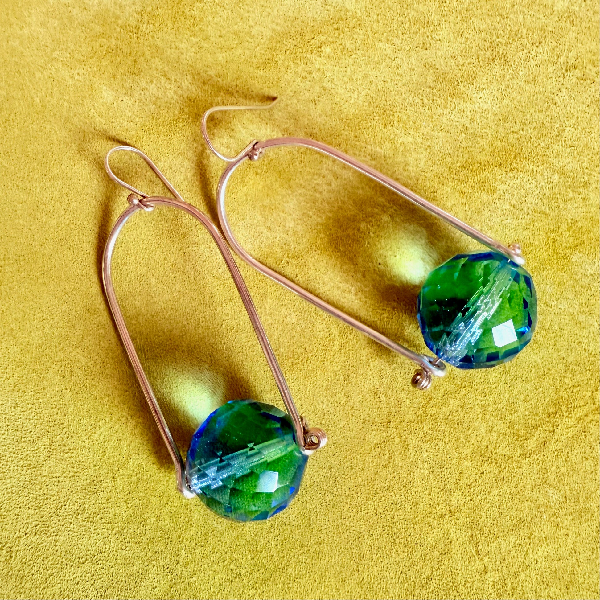 These earrings add a huge dose of glamor and levity to any look, plus they work double-time as a fidget! Sterling silver and vintage uranium glass beads that glow under blacklight. Three color ways available: pink lemonade (pink + yellow), watermelon (pink + green), and blueberry (blue + green). 2.25" drop, 1" width.