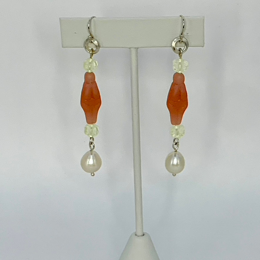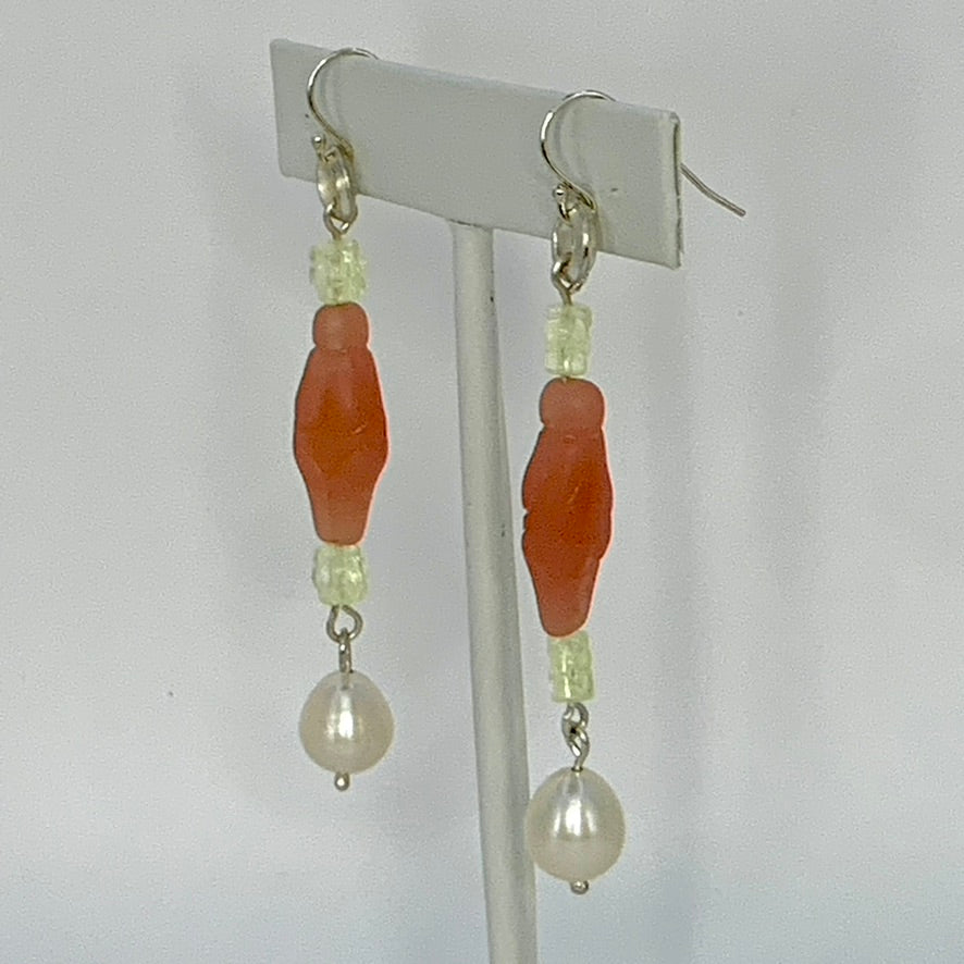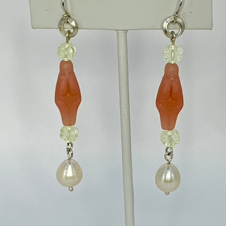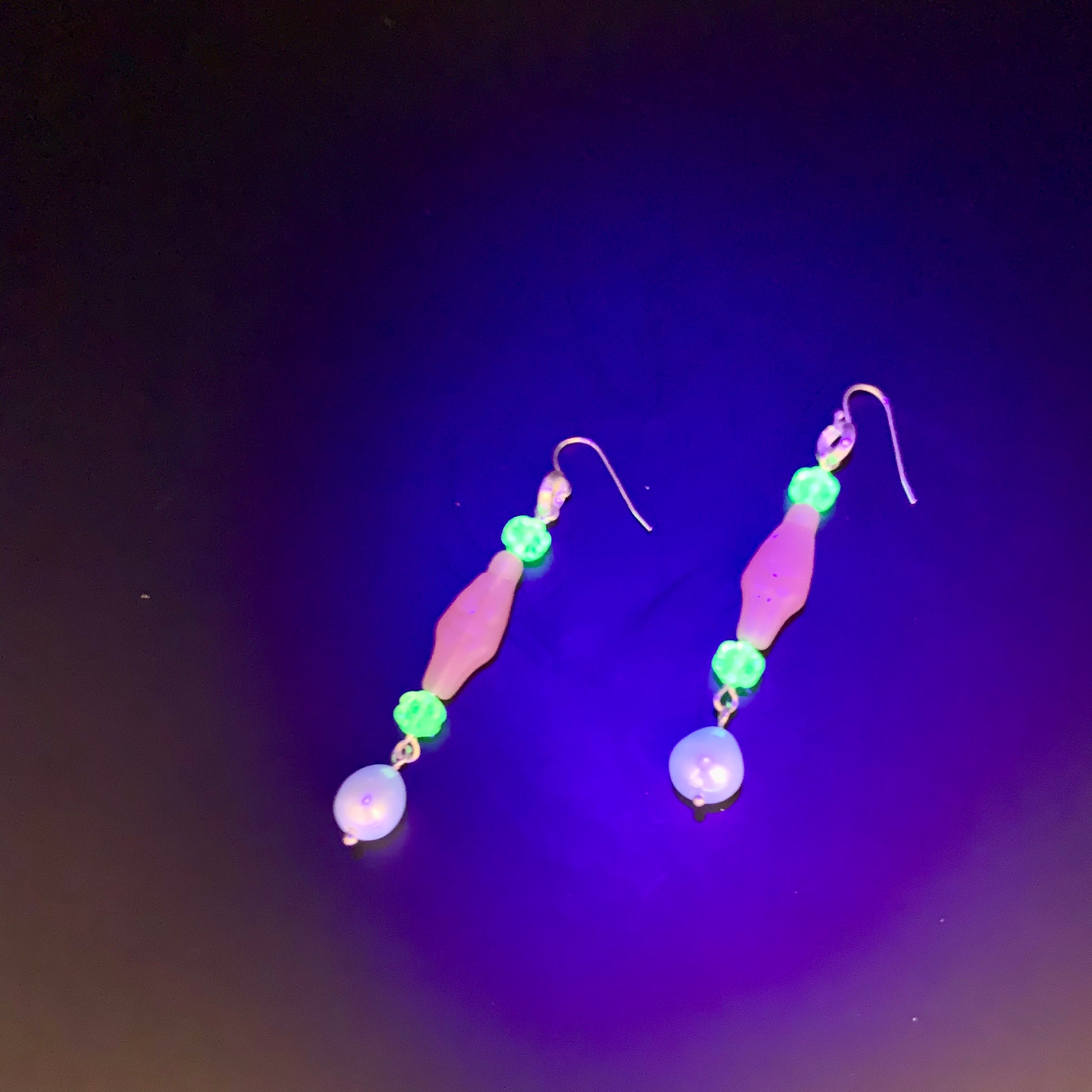Sterling silver, pearls, vintage glass Venus beads, uranium glass (glows under blacklight!).