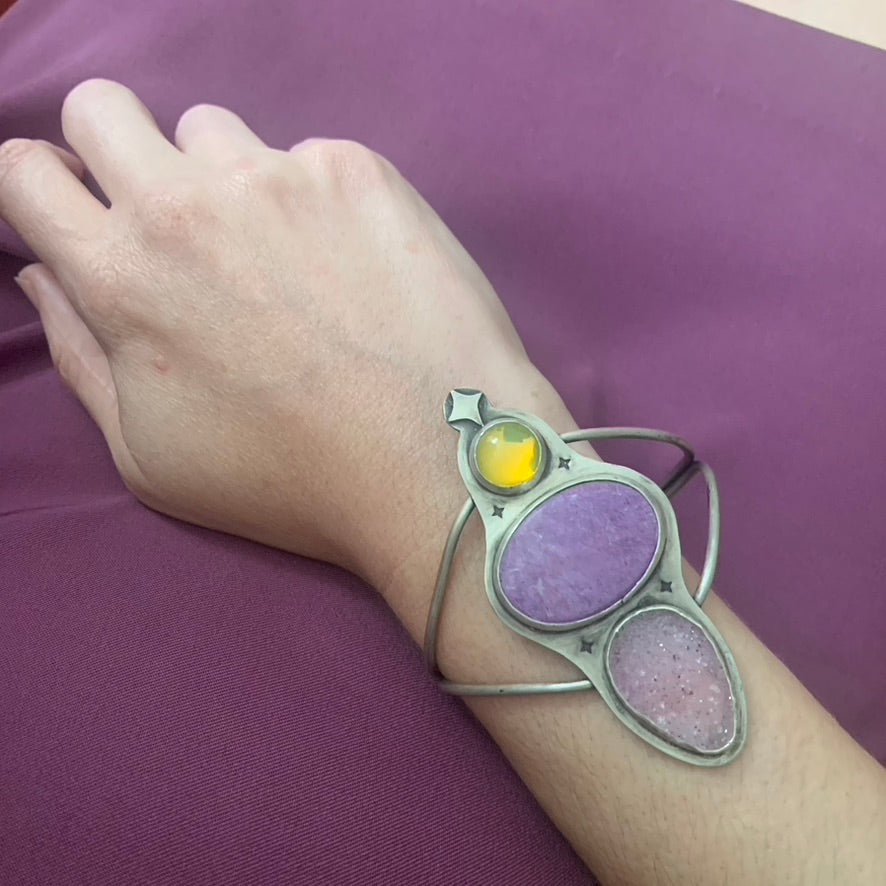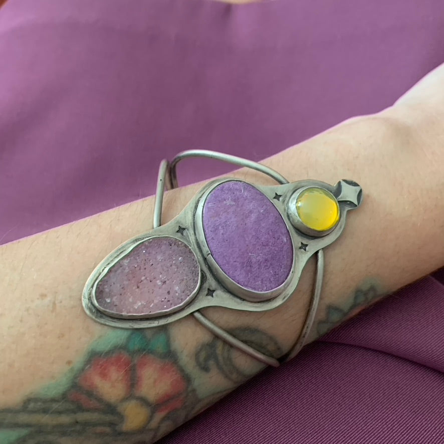 Materials: sterling silver, uranium glass (glows under blacklight!), stichtite, pink druzy