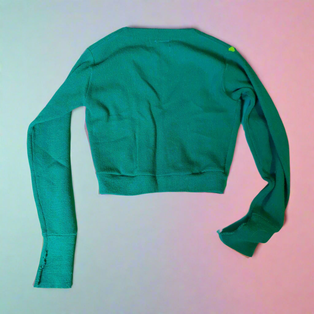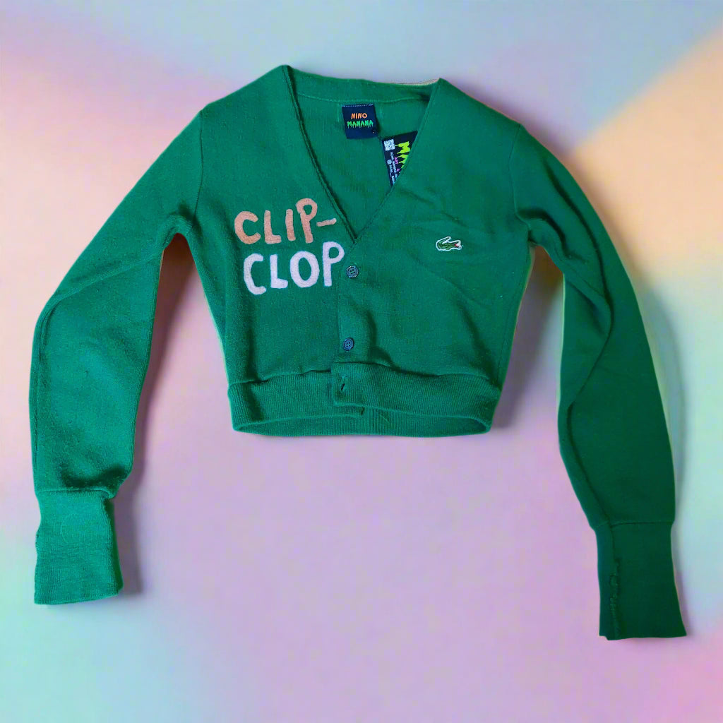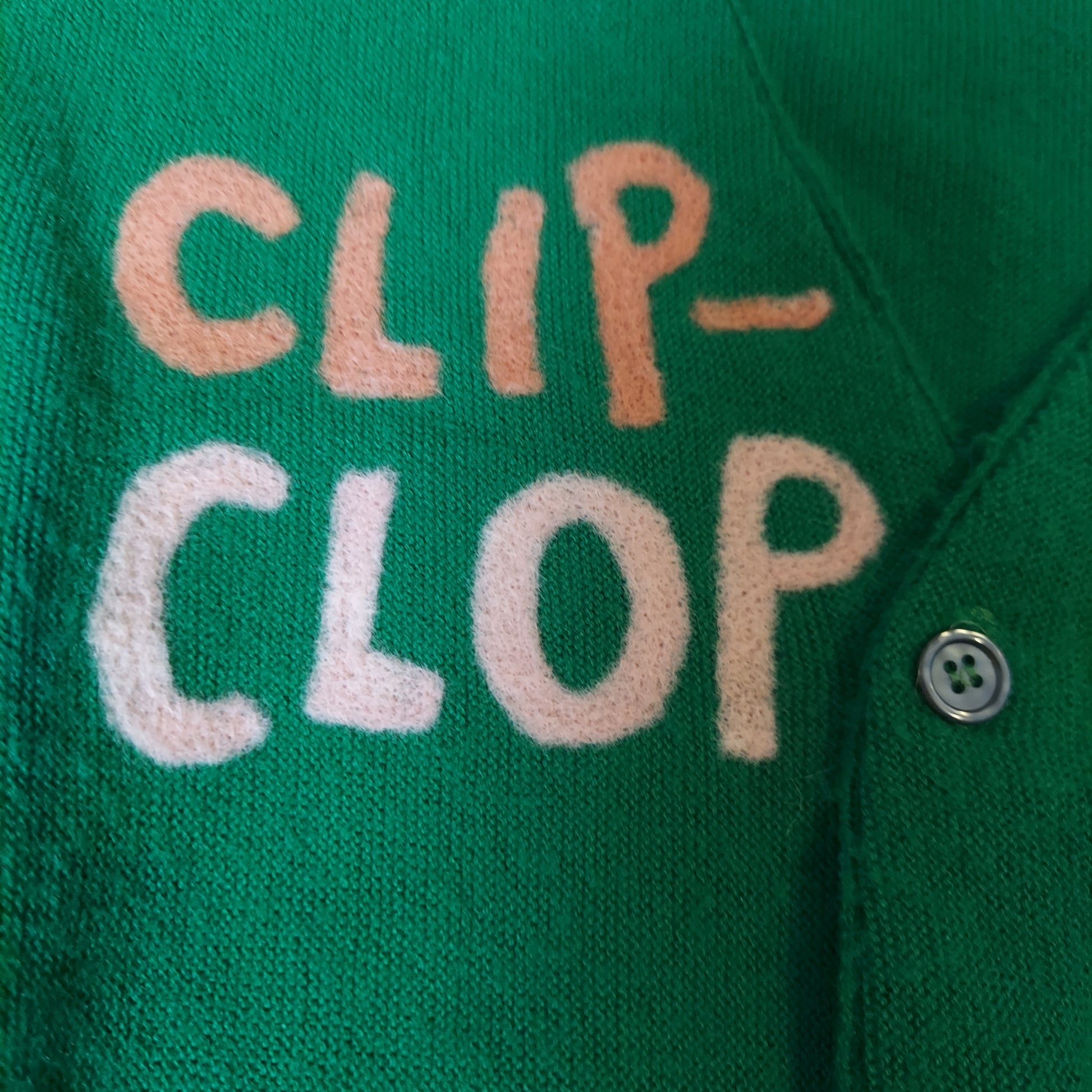 This cardigan has been repurposed and features Clip Clop felted in. Its length is short, almost reaching a cropped style.