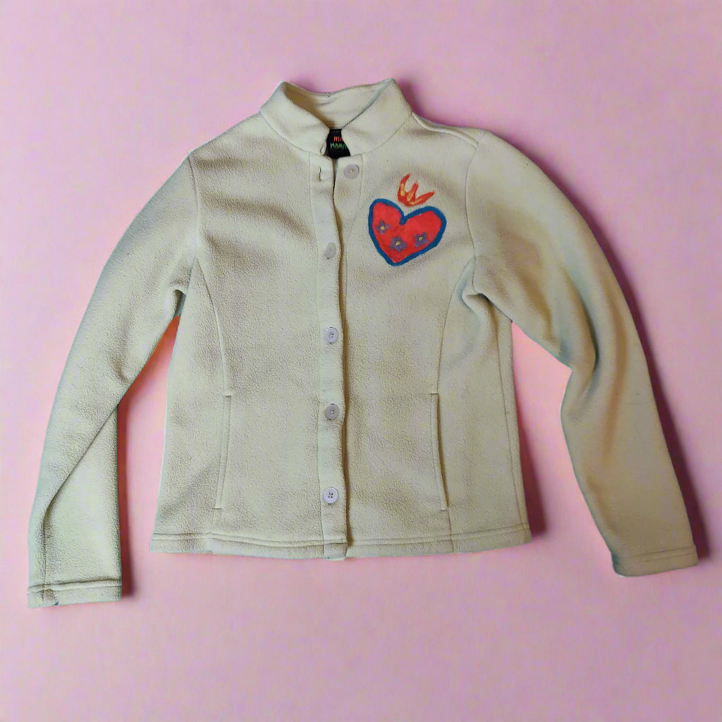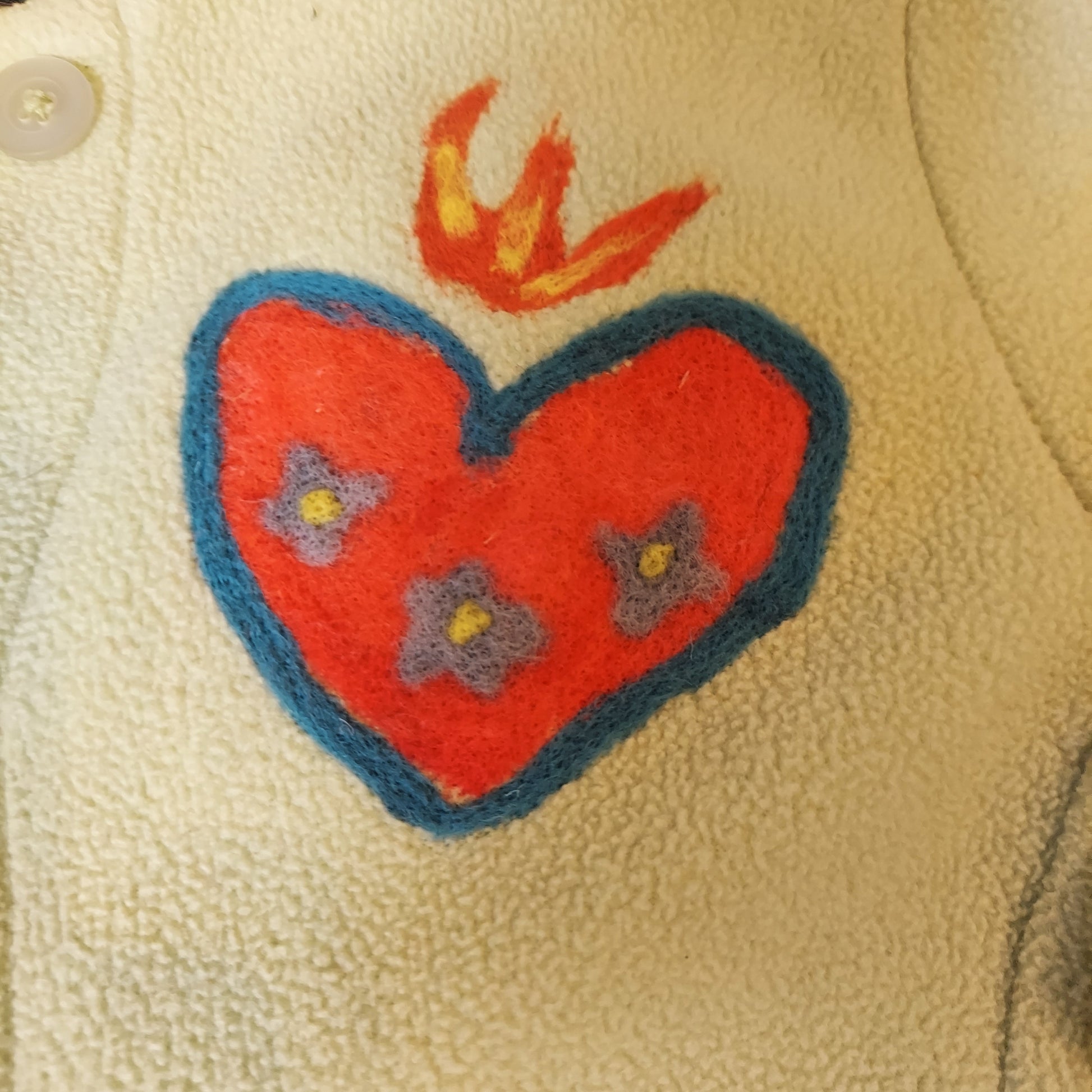 A soft fleece with a felted sacred hear on its breast