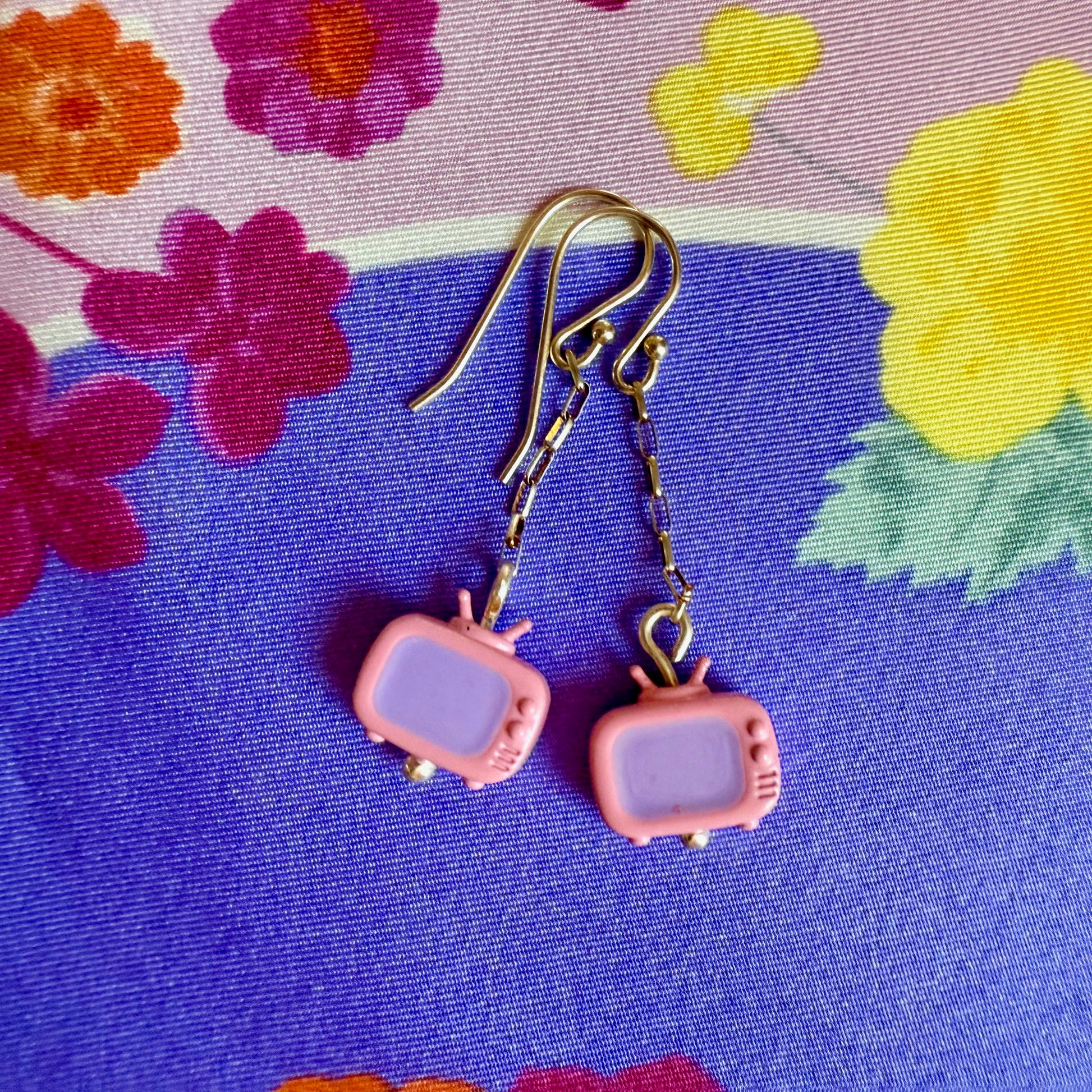 Made with sterling silver, vintage enameled TV charms. Length is 1.75 in.