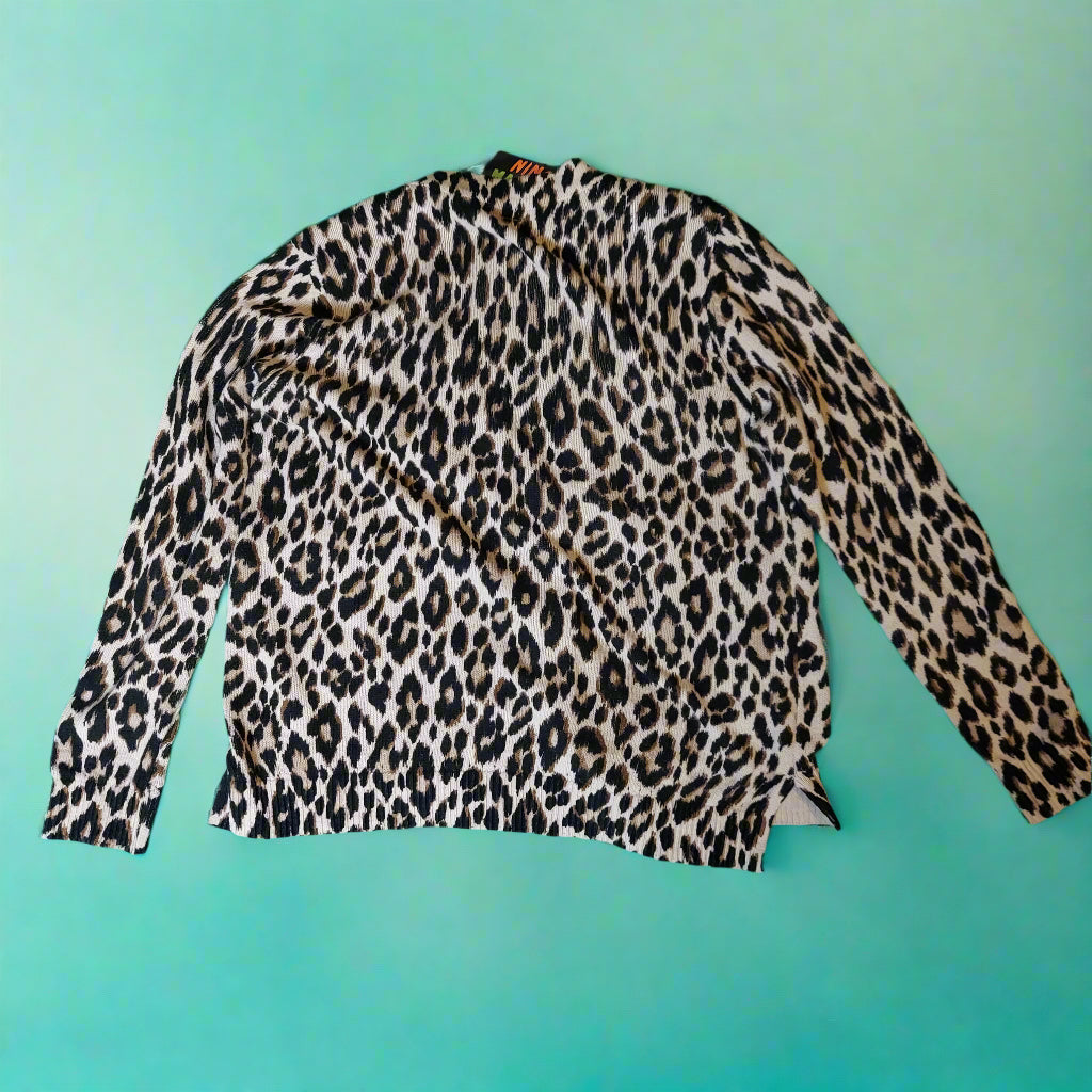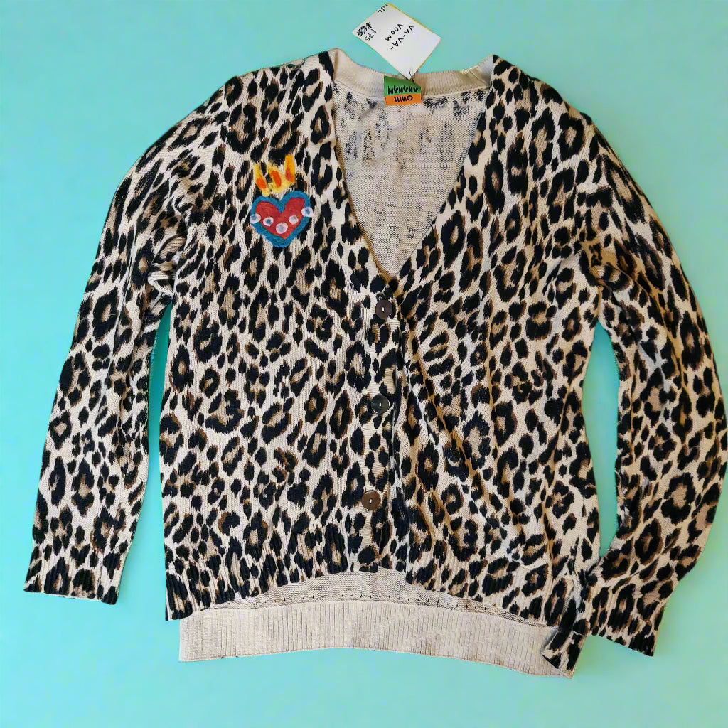 This leopard print Cardigan has a sacred heart felted in on the right shoulder.