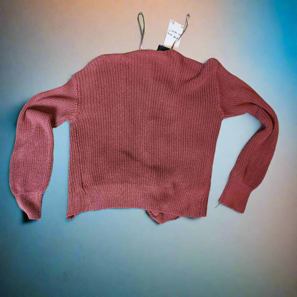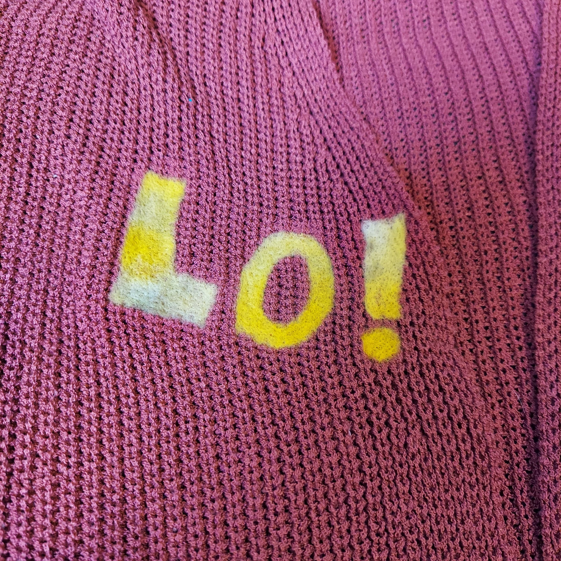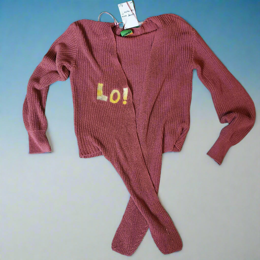 This earth-red sweater has tails on the front and "Lo!" felted into the right panel.