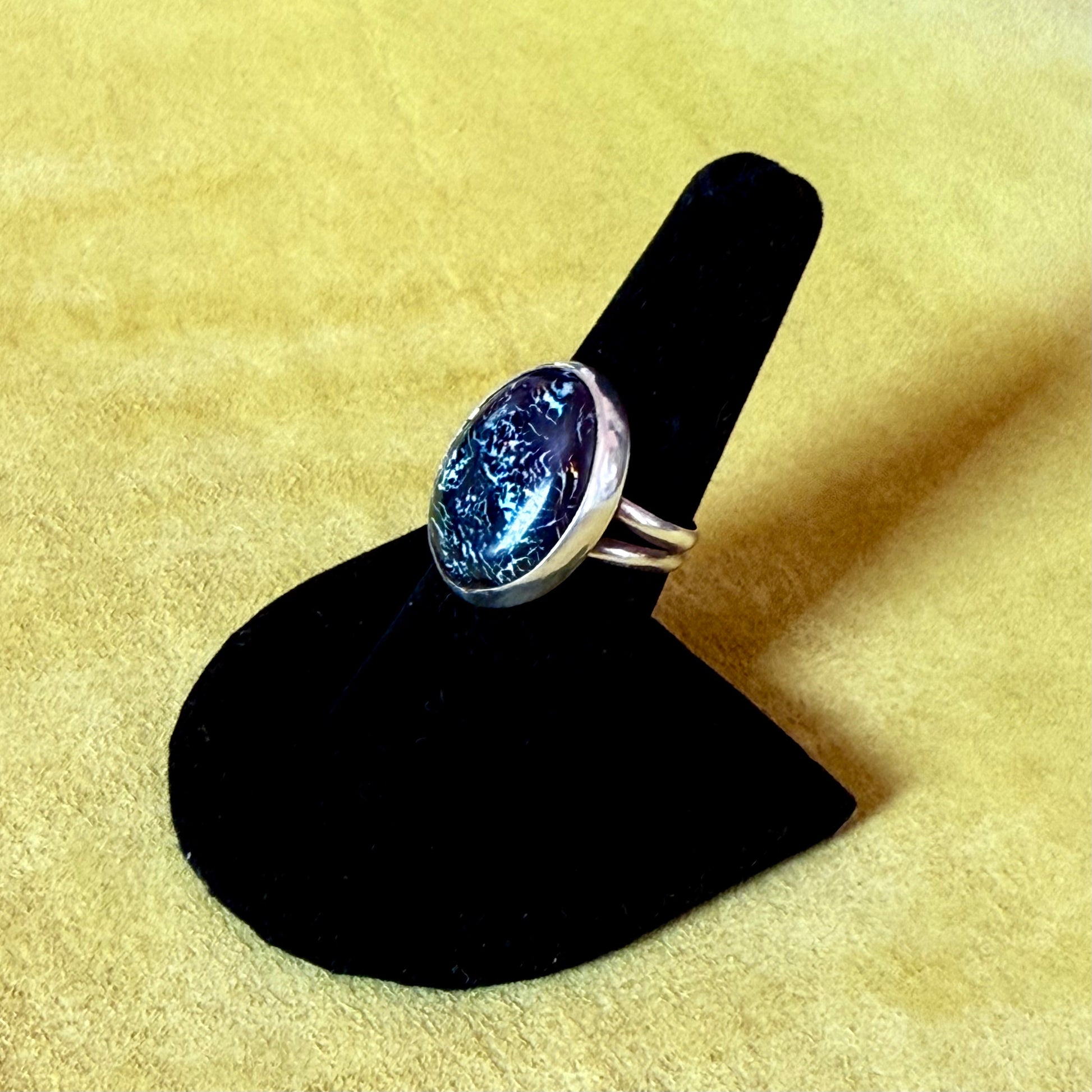 One of a kind sterling silver ring featuring a split shank and bezel-set black opal. There's a rainbow just bursting to escape! Stone measures 18mm x 23mm.